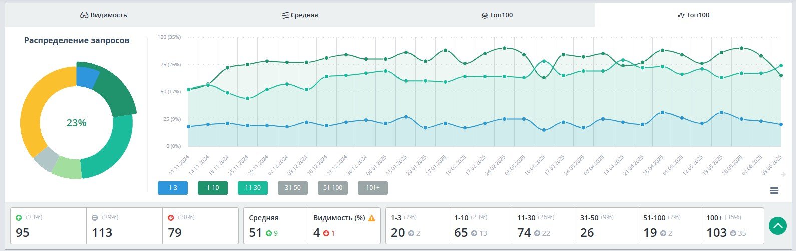 К началу 2023 года проект достиг стабильных показателей — 45-50% запросов уверенно держались в ТОП-10. Можно было сказать, что качественный прорыв состоялся.