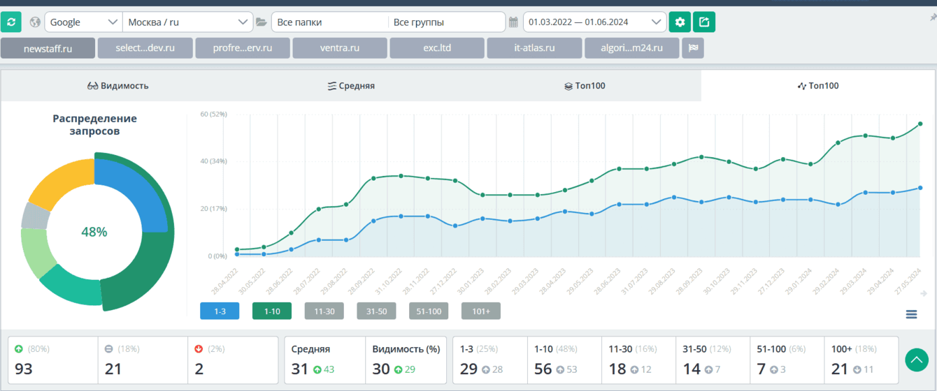 Финальные цифры говорят сами за себя: с абсолютного нуля до половины запросов в топе за 12 месяцев. Newstaff получила мощнейший канал лидогенерации и заняла лидирующие позиции в своей нише.