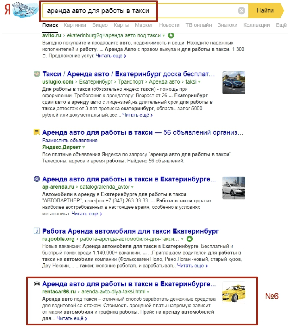 Сайт не появлялся в ТОП даже по локальным запросам вроде "аренда авто Екатеринбург" или "машина для такси в аренду".