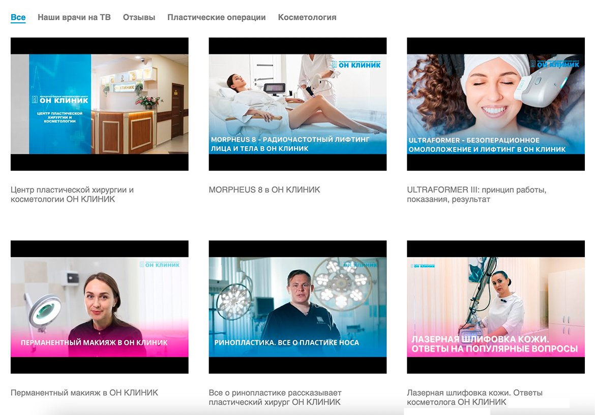 Для увеличение среднего времени нахождения на сайте реализовали модуль со списком видеороликов, есть возможность выбрать интересующую категорию контента. Видеоролики также размещены на релевантных страницах врачей, услуг и направлений.