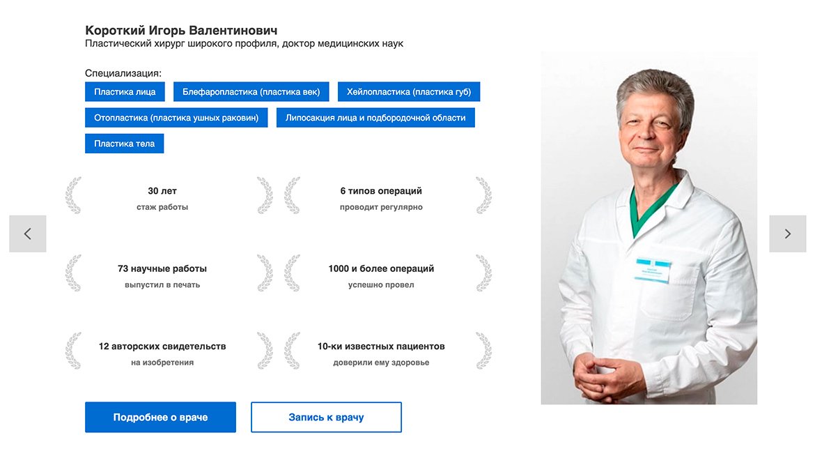На посадочных страницах с врачами реализовали блок с врачами в виде слайдера, отдельно выделили регалии каждого врача, а также виды оказываемых услуг