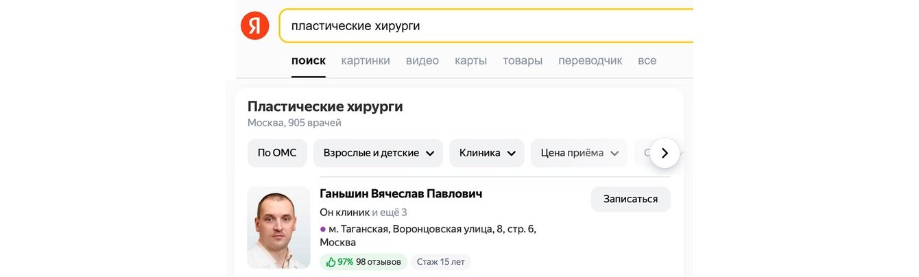 Врачи «ОН КЛИНИК» отображаются в специальном блоке Яндекса при вводе такого запроса, как "Пластический хирург". Для реализации задачи использовалась выгрузка в формате YML, также врачам были присвоены специализации, специально подобранные под семантическое ядро для улучшения в выдаче данного сниппета.