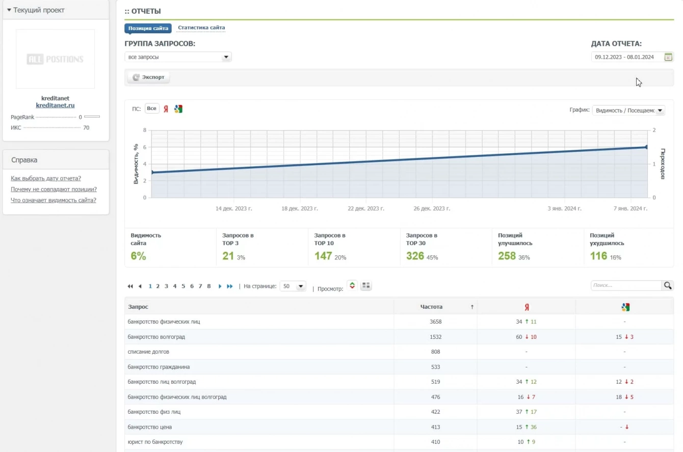 К нам обратилась компания по банкротству физ. лиц и ИП Kreditanet (уже более 2-х лет назад, работаем по текущий момент на дату написания кейса). Клиент пришел с запросом с нуля начать проработку SEO продвижения сайта для привлечения клиентов. Задача выйти в ТОП в Волгоградской области. Ниша сверхконкурентная и сложная, несмотря на это у нас выдающиеся результаты.