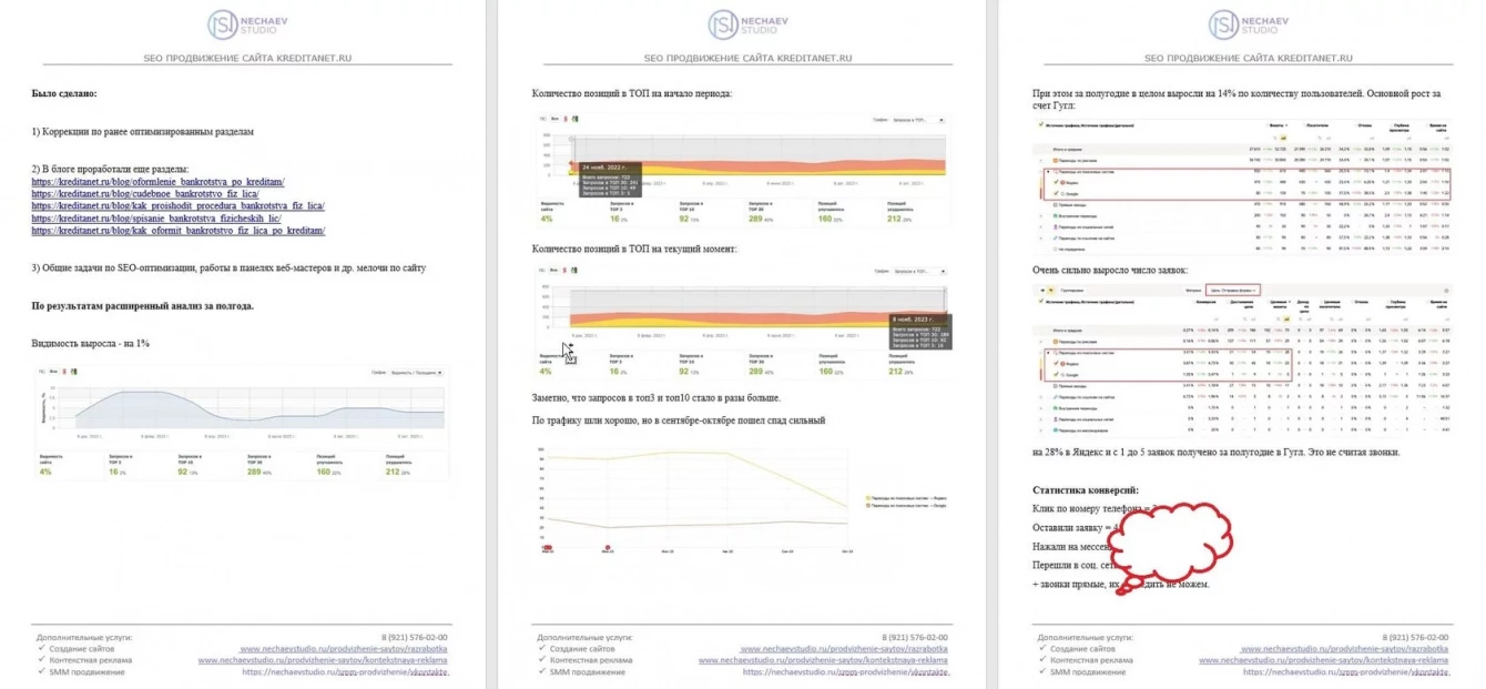Вот так у нас выглядит ежемесячные отчеты по SEO продвижению:.