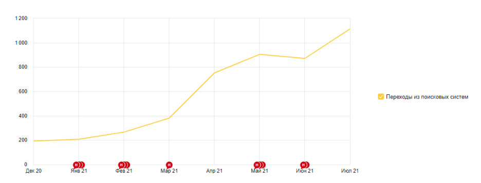Увеличение поискового трафика до 1 100 посещений в месяц в период с декабря 2020 по июль 2021 года.