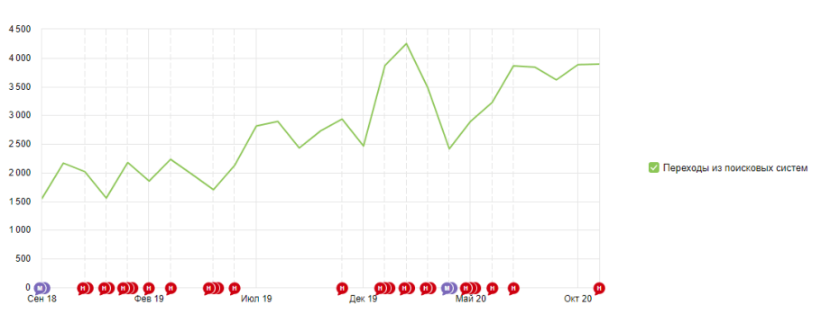 Увеличение поискового трафика до 4 000 посещений в месяц в период с сентября 2018 по ноябрь 2020 года.