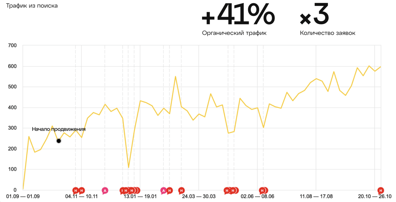 После этого сайт начал «понятно» выглядеть для поисковиков и начал получать трафик не только по брендовым запросам.