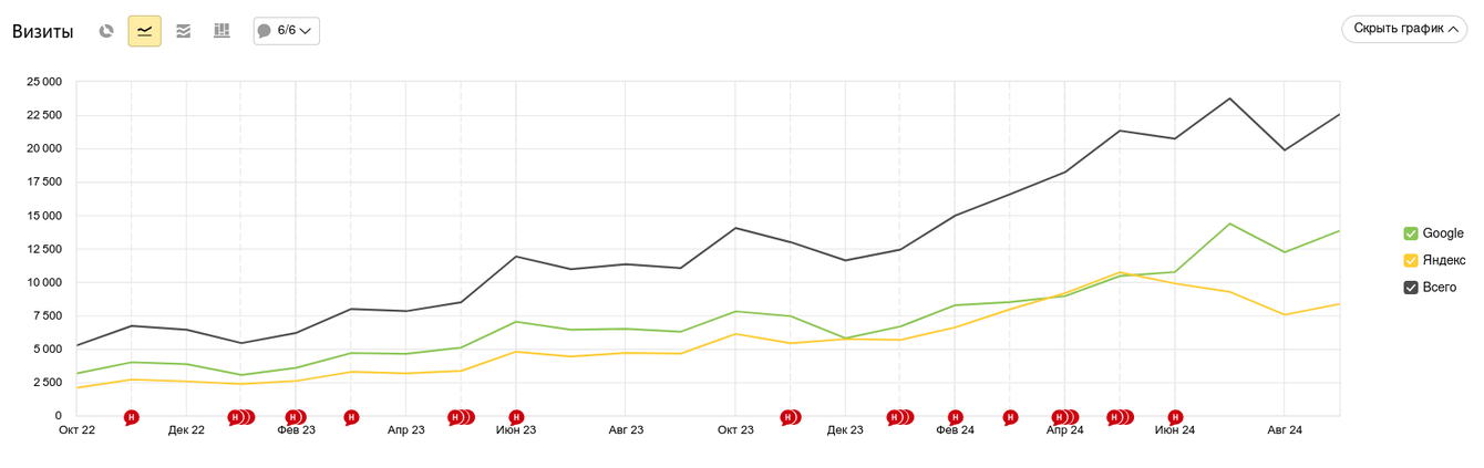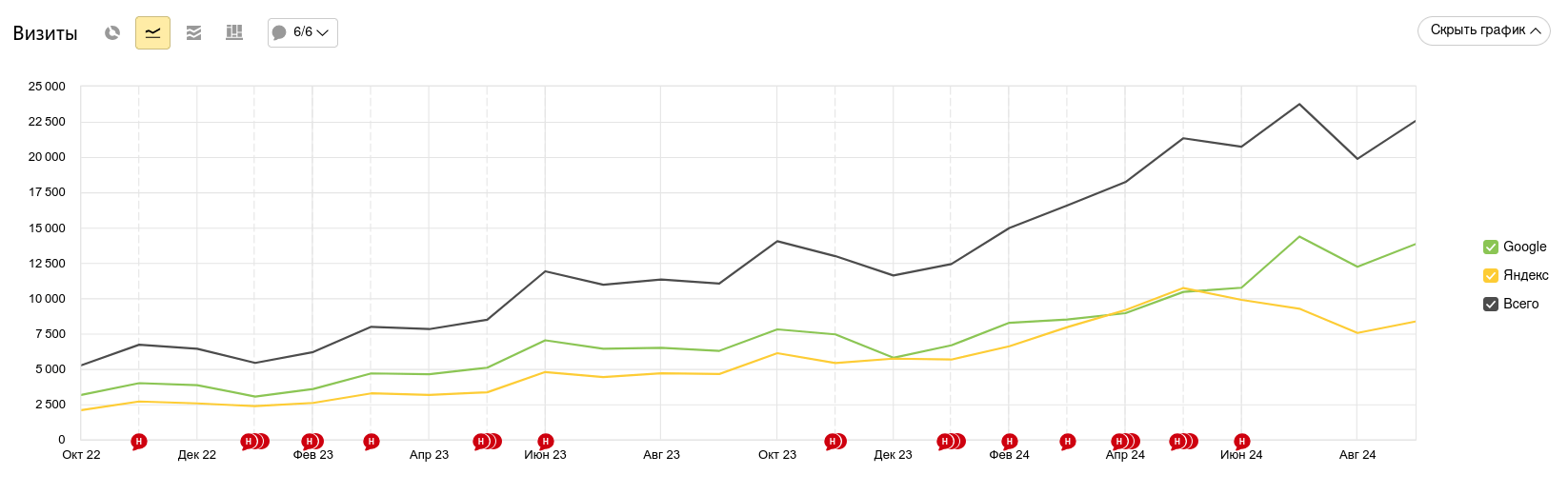Аналитика велась непрерывно: отслеживались позиции, индексируемость, видимость, корректность сниппетов. Это позволило вовремя реагировать на изменения алгоритмов поисковых систем и сохранять стабильную положительную динамику.
