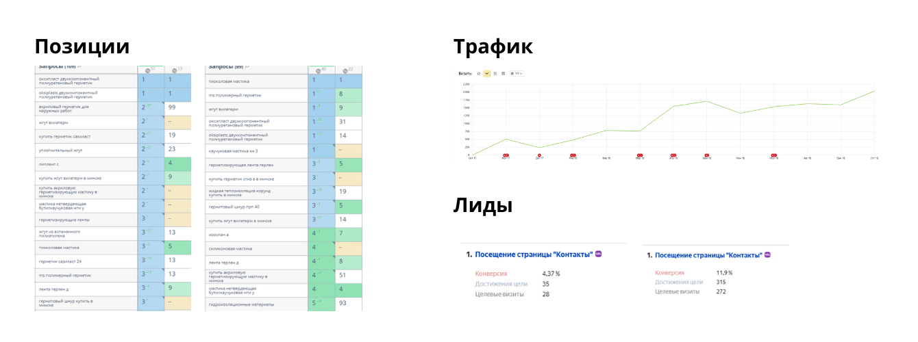 - Лиды: В первые месяцы работы мы привели на сайт 35 лидов, и клиент полностью окупил стоимость работ. Через год эта цифра увеличилась почти в 9 раз — до 315 лидов в месяц.