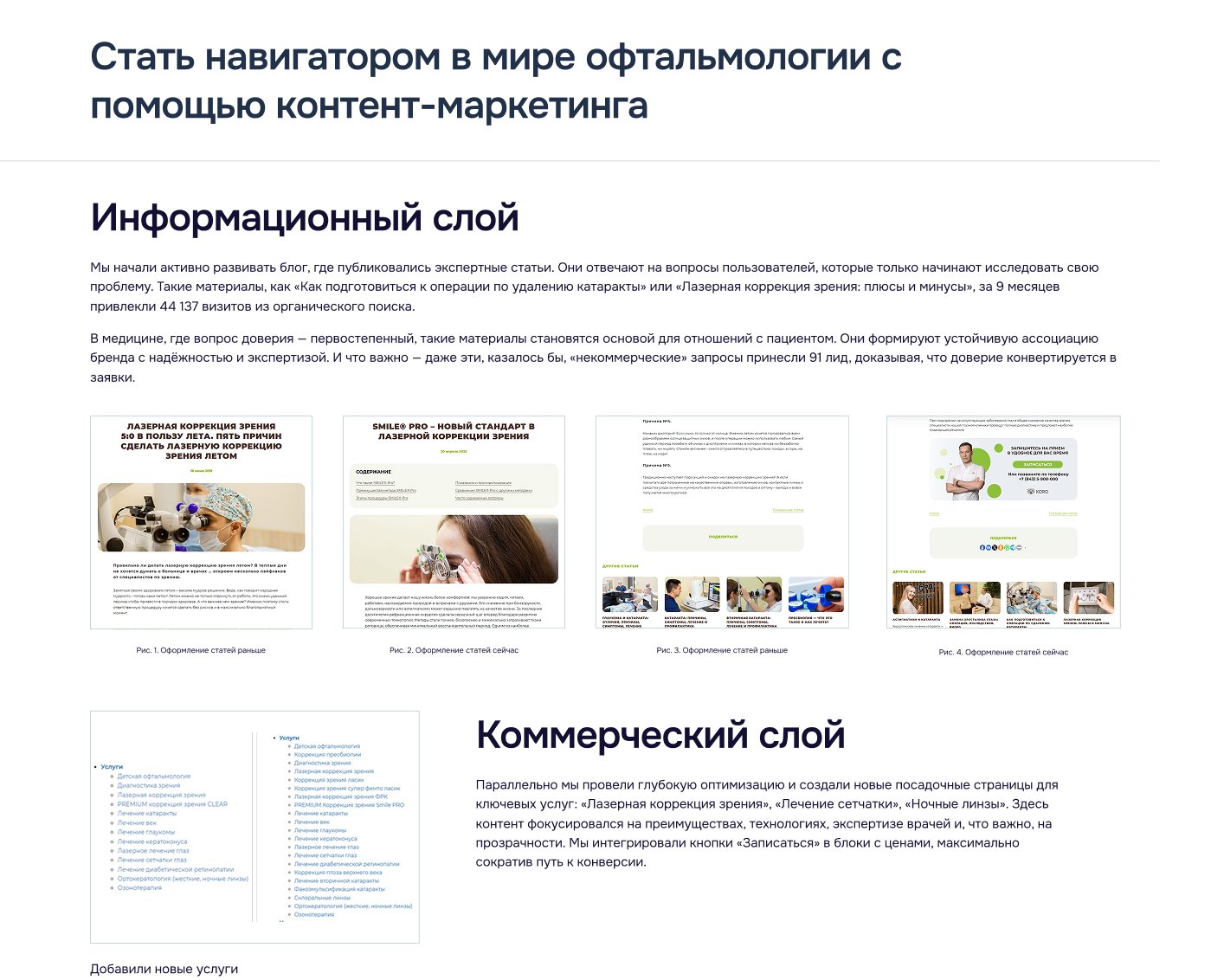 — Коммерческий слой: созданы и оптимизированы посадочные страницы услуг с фокусом на технологии, врачей и прозрачность цен.