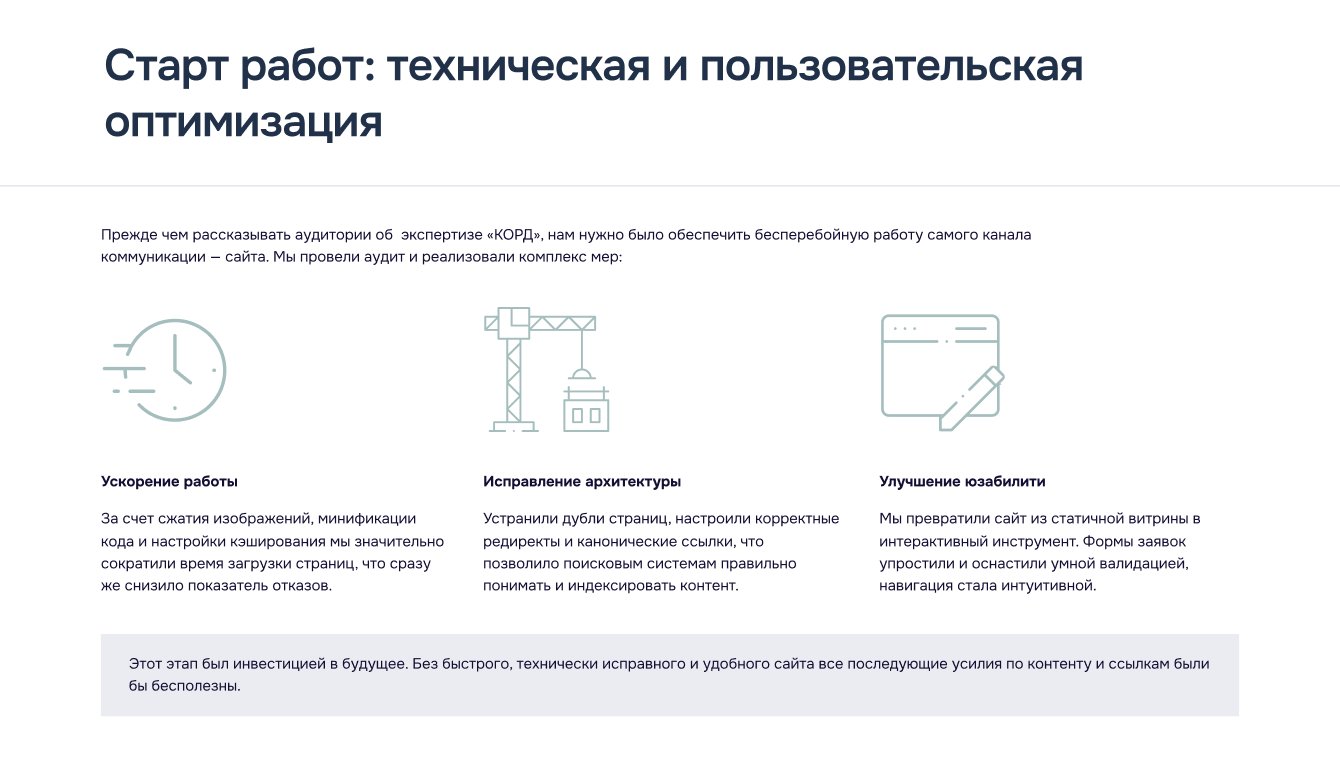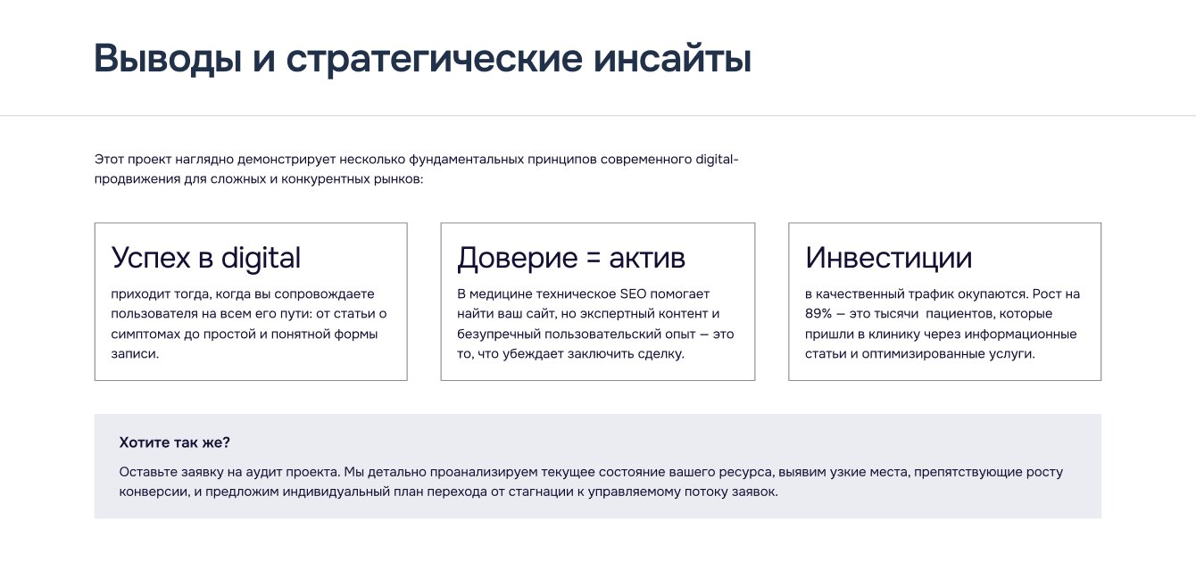 Кейс клиники «КОРД» подтверждает, что в медицине техническое превосходство сайта лишь создает возможность контакта, но экспертный контент — это то, что превращает посетителя в пациента. Мы перешли от борьбы за позиции к маркетингу клиентского пути, где каждый элемент сайта работает на укрепление доверия. Рост на 89% — это результат системной работы над ценностью ресурса для людей.