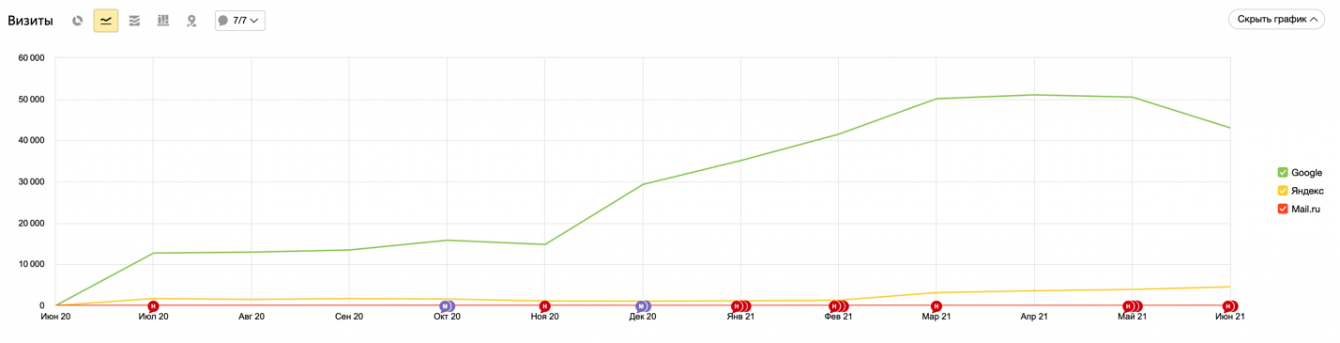 В результате проделанной работы сайт безболезненно пережил редизайн, а в последующем значительно увеличил количество переходов из поисковых систем. Особенно впечатляющим был результат в Google, т.к. здесь мы сознательно не привязывались к региону нахождения заказчика и продвигали информационные статьи и раздел «вопрос-ответ» по всей России.Тем не менее в Яндексе региональный трафик так же вырос в 4 раза благодаря оптимизации и активному контентному продвижению. Рост числа поисковых переходов: