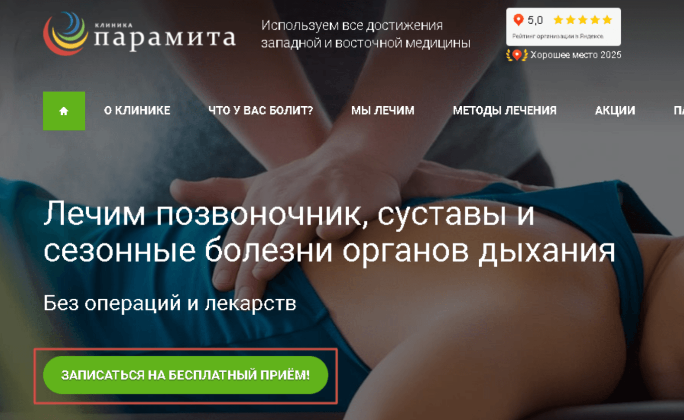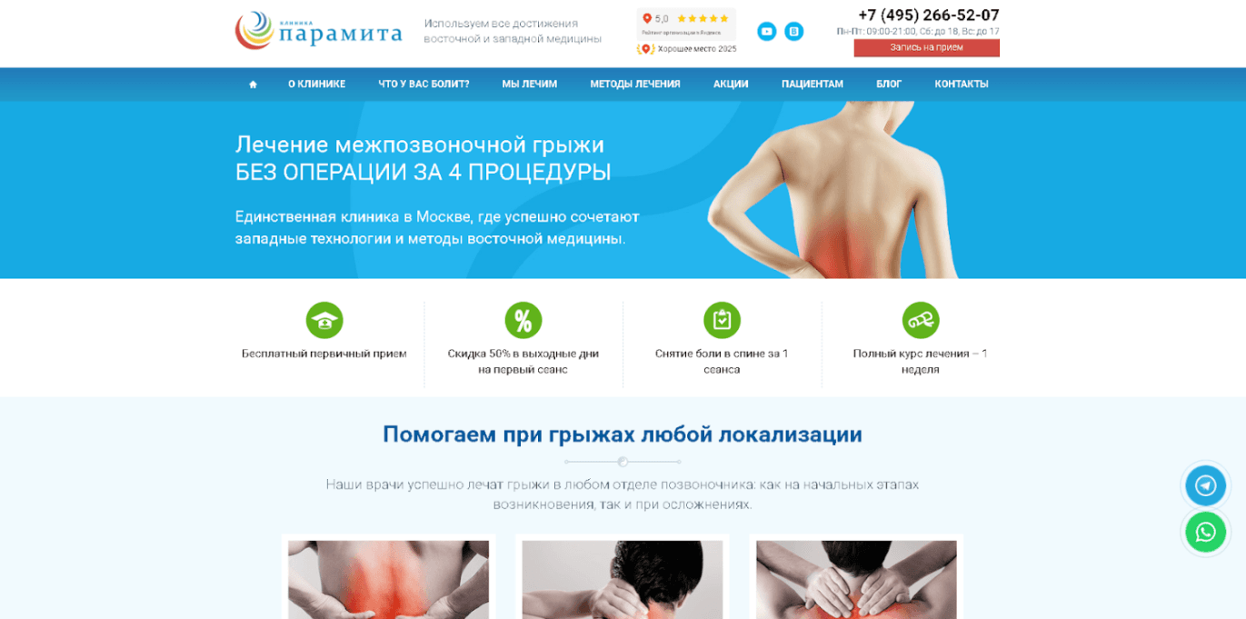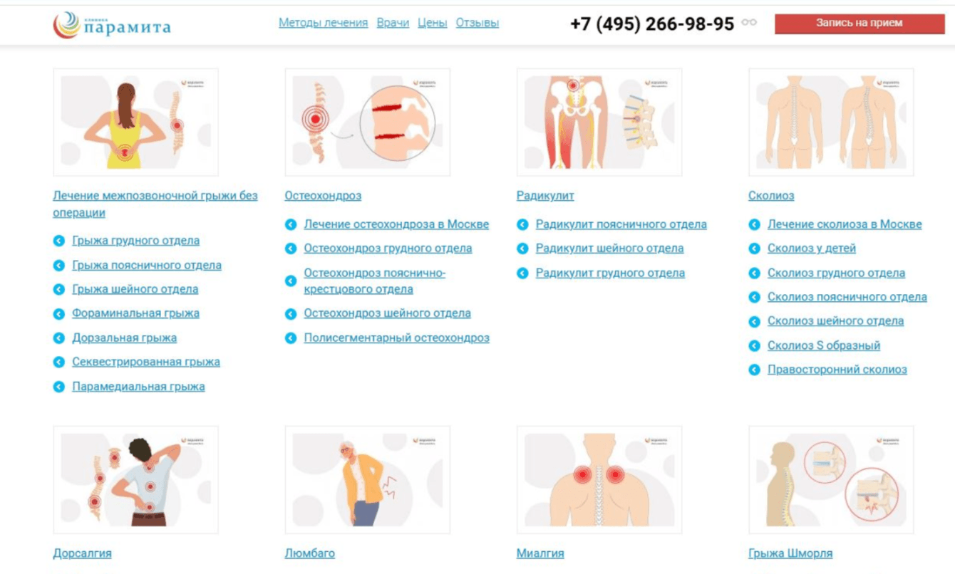 Основной фокус был сделан на врачах и широком спектре заболеваний, которые лечит «Парамита». Семантика в медицине огромна: от остеохондроза грудного, поясничного или шейного отдела до артрита коленного, локтевого суставов.