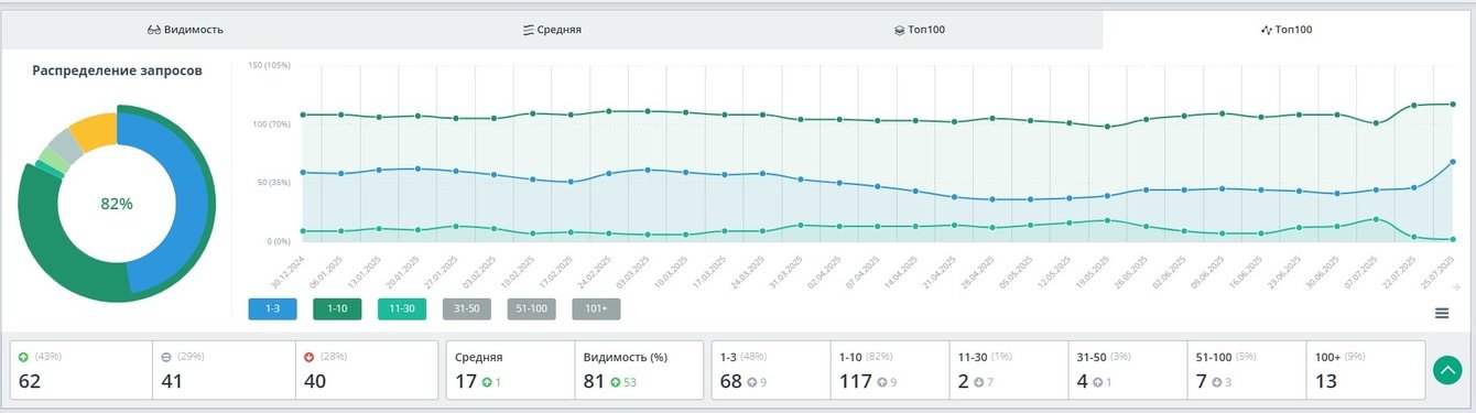 По отдельным кластерам показатели еще выше: кластер «Уборка помещений» занимает 73% запросов в топ-10, «Уборка офисов» — 68%.