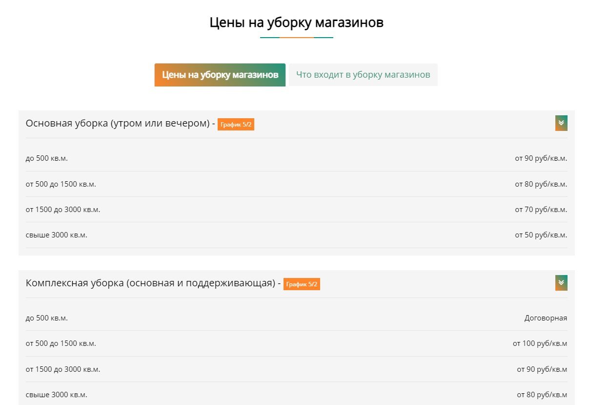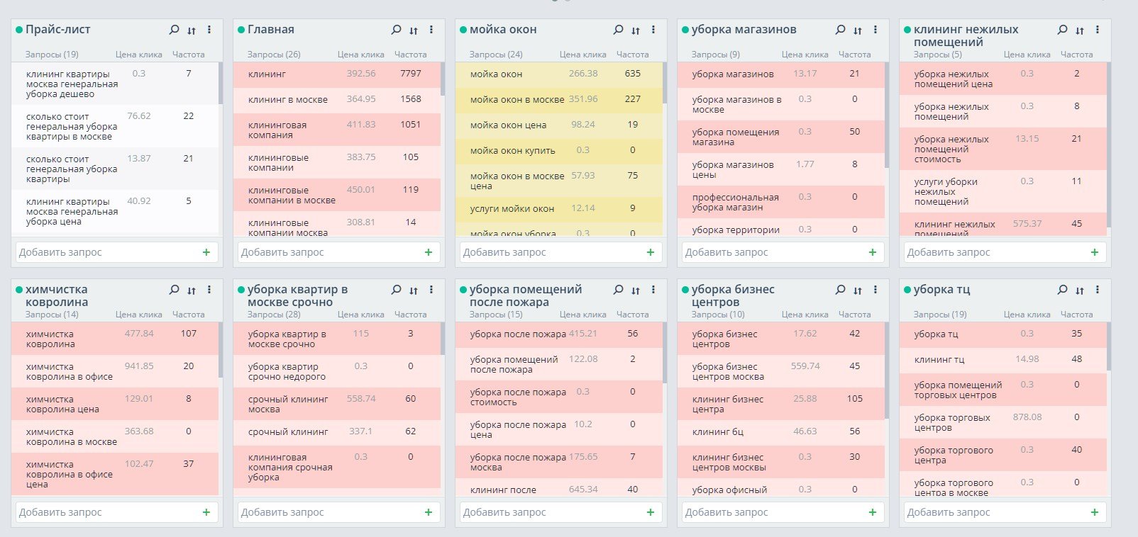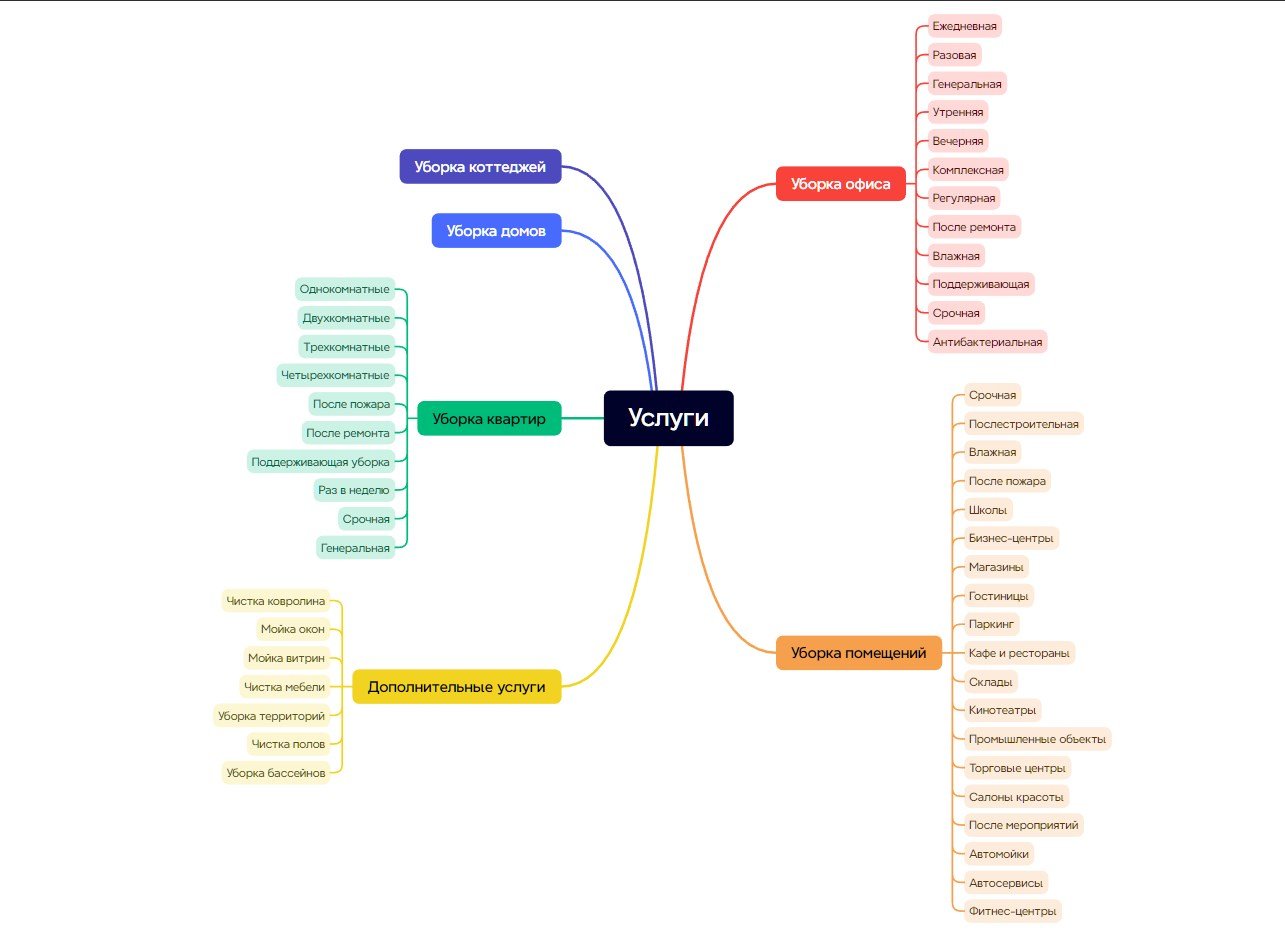 На основе анализа сформировали расширенную структуру услуг. Она охватывала потребности корпоративных клиентов и частных лиц. По согласованной структуре собрали семантическое ядро — более 700 запросов от общих до специфичных вроде «генеральная уборка после ремонта».