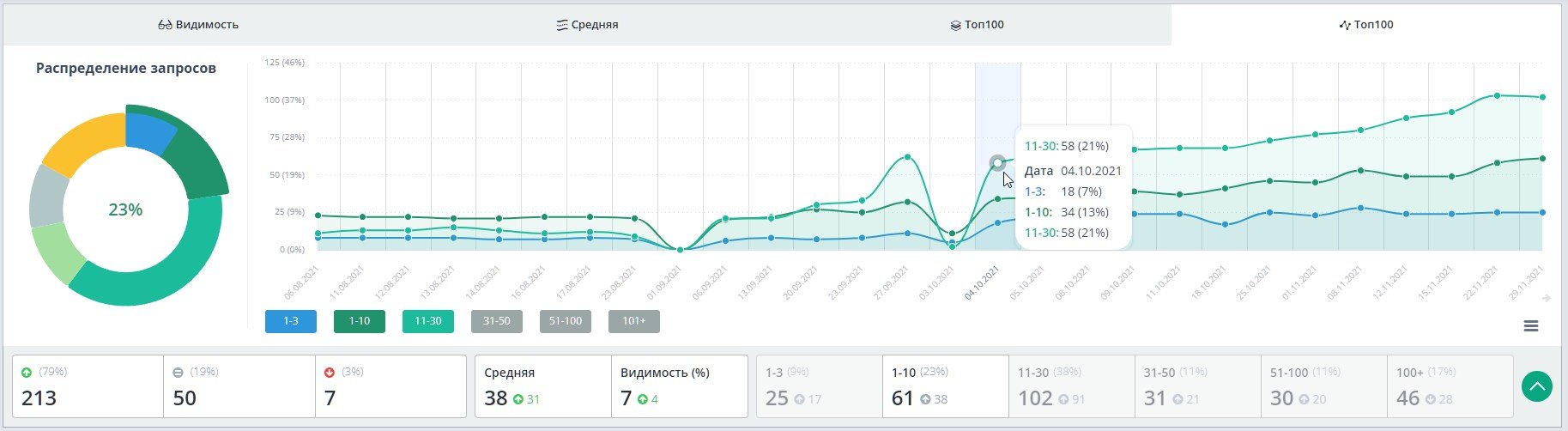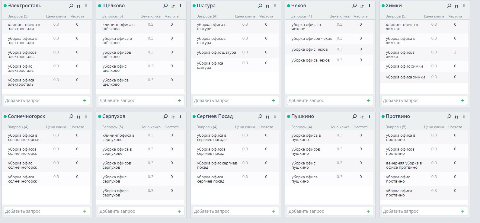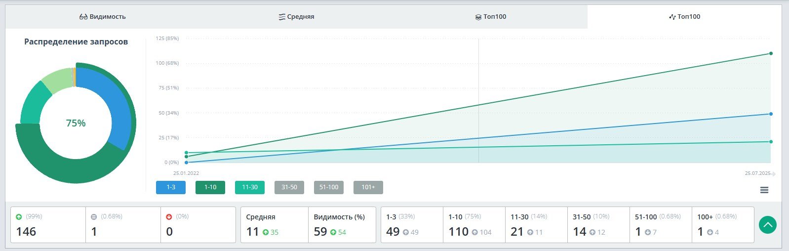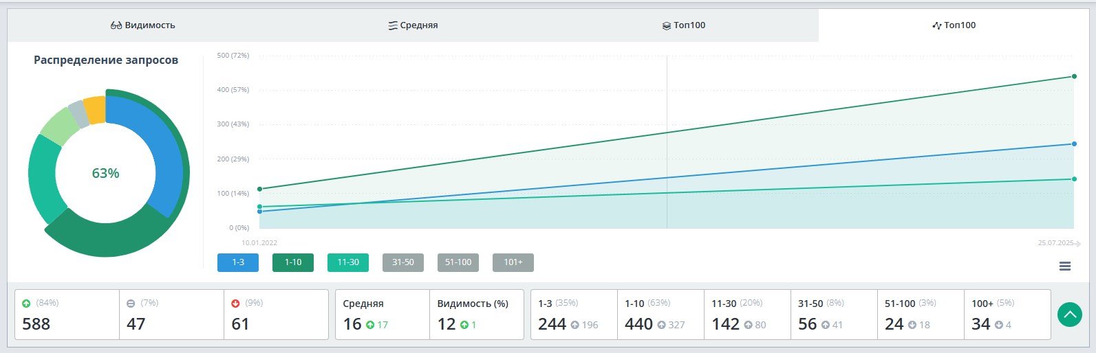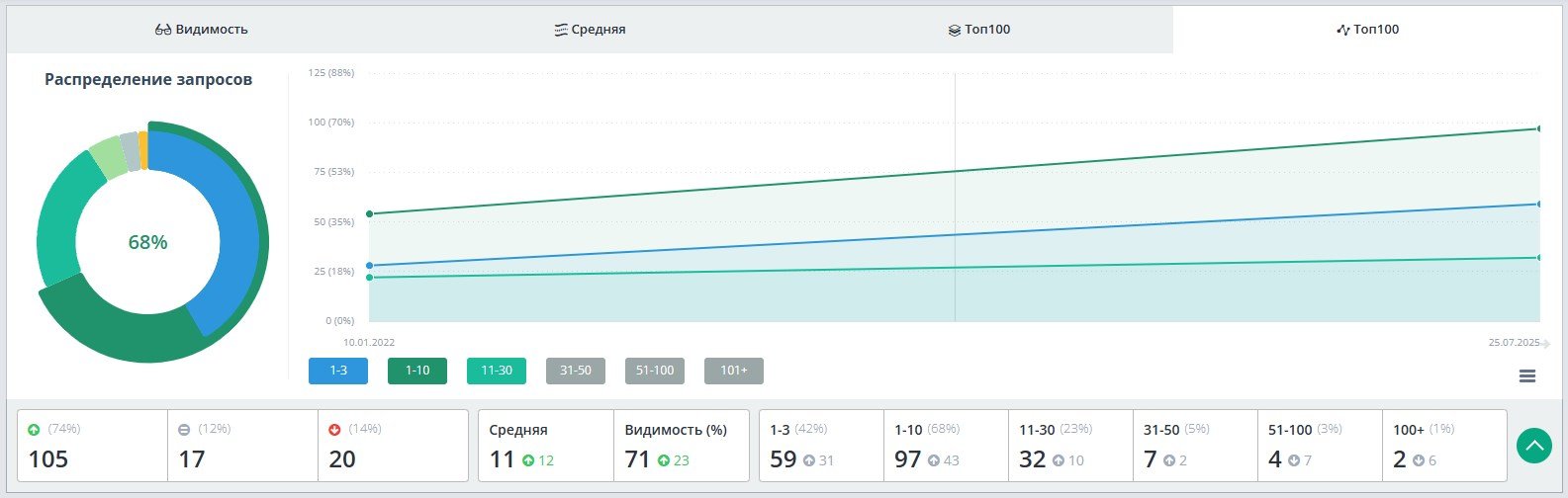 По отдельным кластерам показатели еще выше: кластер «Уборка помещений» занимает 73% запросов в топ-10, «Уборка офисов» — 68%.