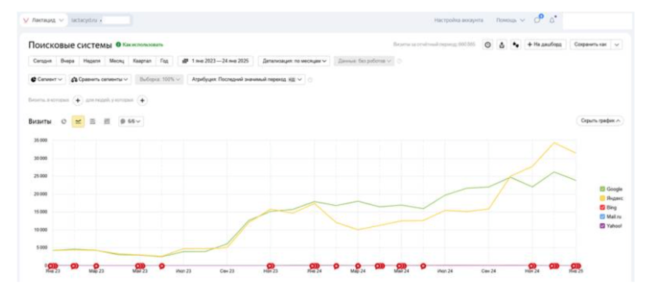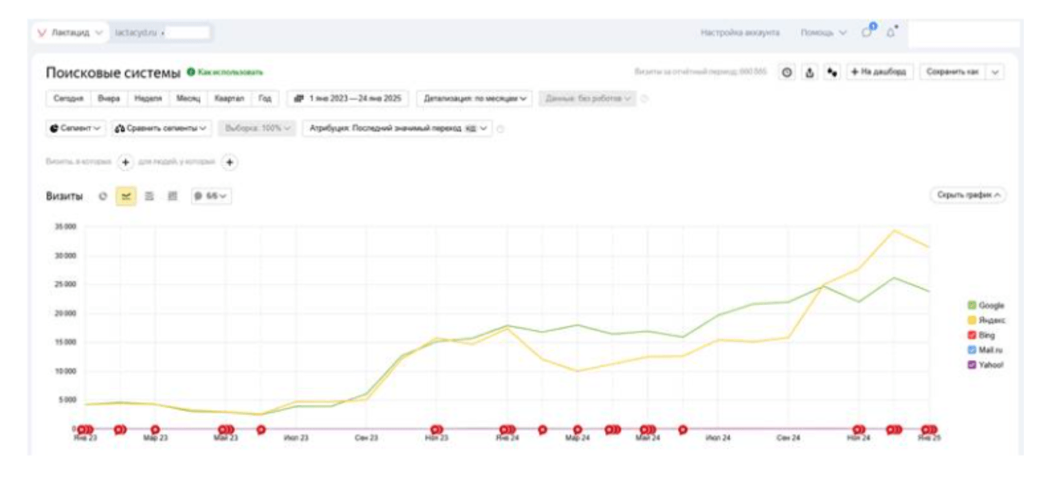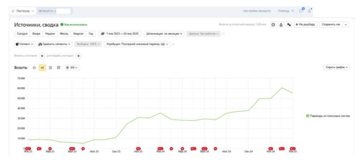 Мы начали работу в феврале 2023 и закончили в декабре 2024. С января по июль 2024 года мы столкнулись с падением трафика в Яндексе из-за редизайна сайта и перехода на новую систему управления. Нам потребовалось время, чтобы исправить ошибки, возникшие в процессе разработки, которые негативно влияли на поведенческие факторы. В итоге все недочеты были устранены, и трафик не только восстановился до прежних уровней, но и продолжил расти.