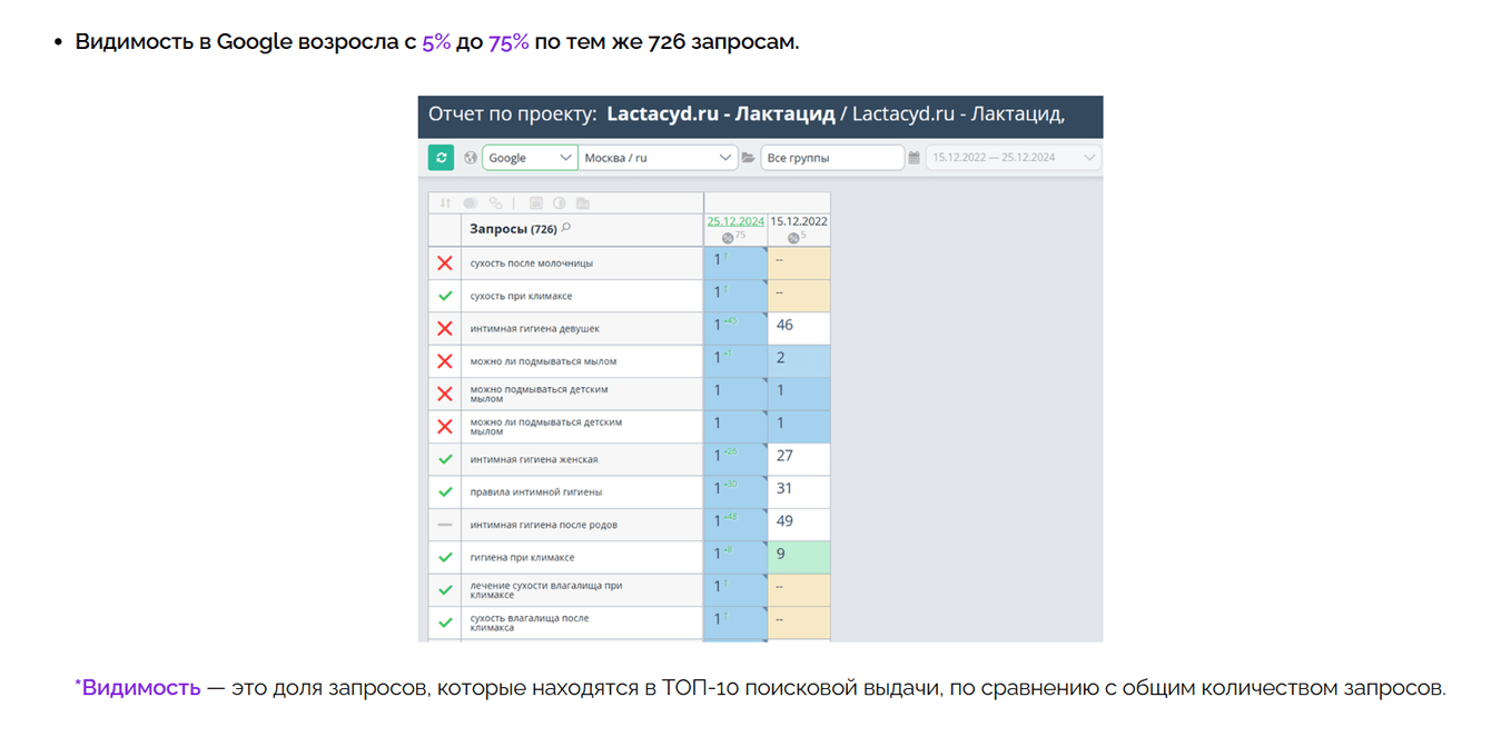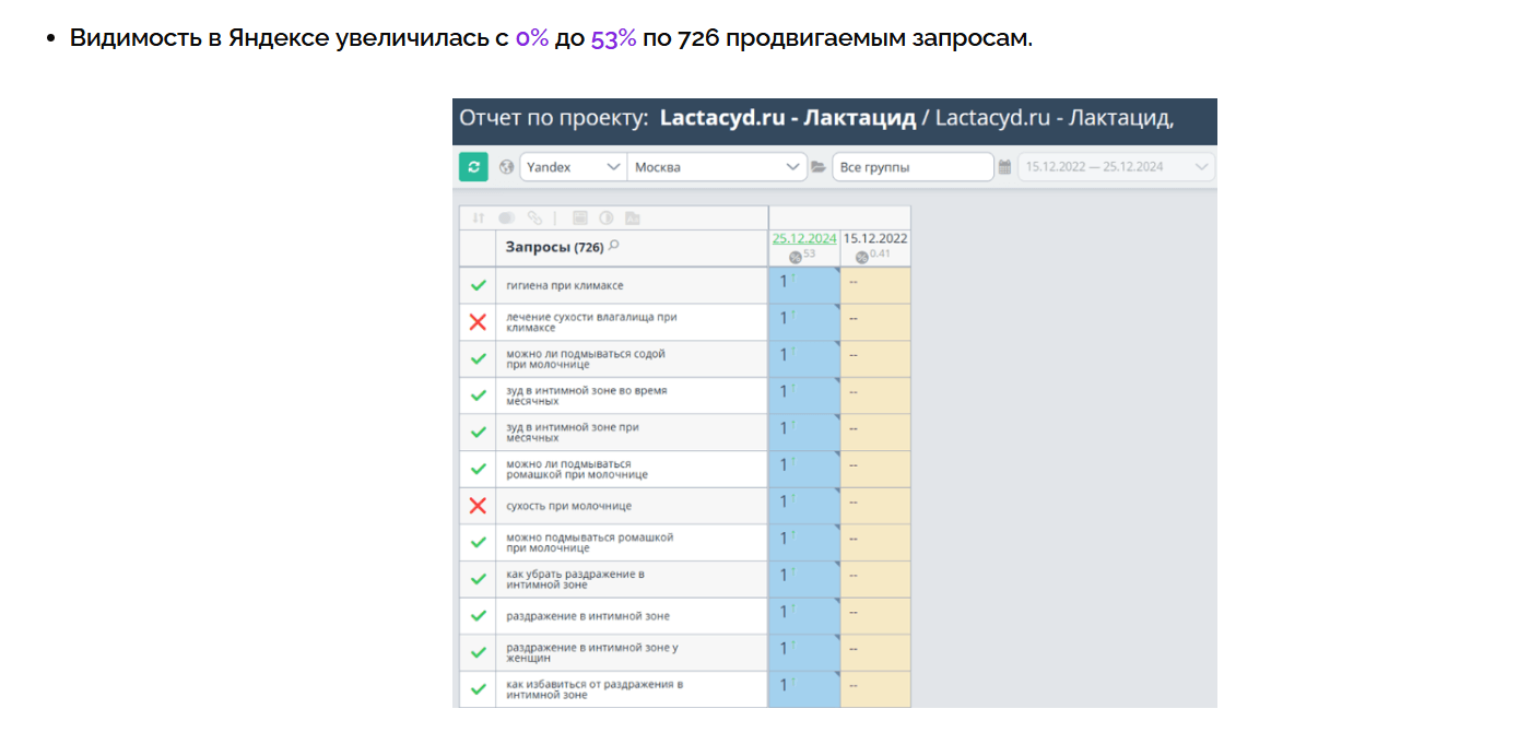 Одним из главных шагов было создание высококачественного контента, который отвечал бы на вопросы и потребности пользователей. Мы разработали информационные статьи, которые не только информировали читателей, но и направляли их в каталог продукции Lactacyd. Это помогло увеличить интерес к бренду и поднять продажи.
