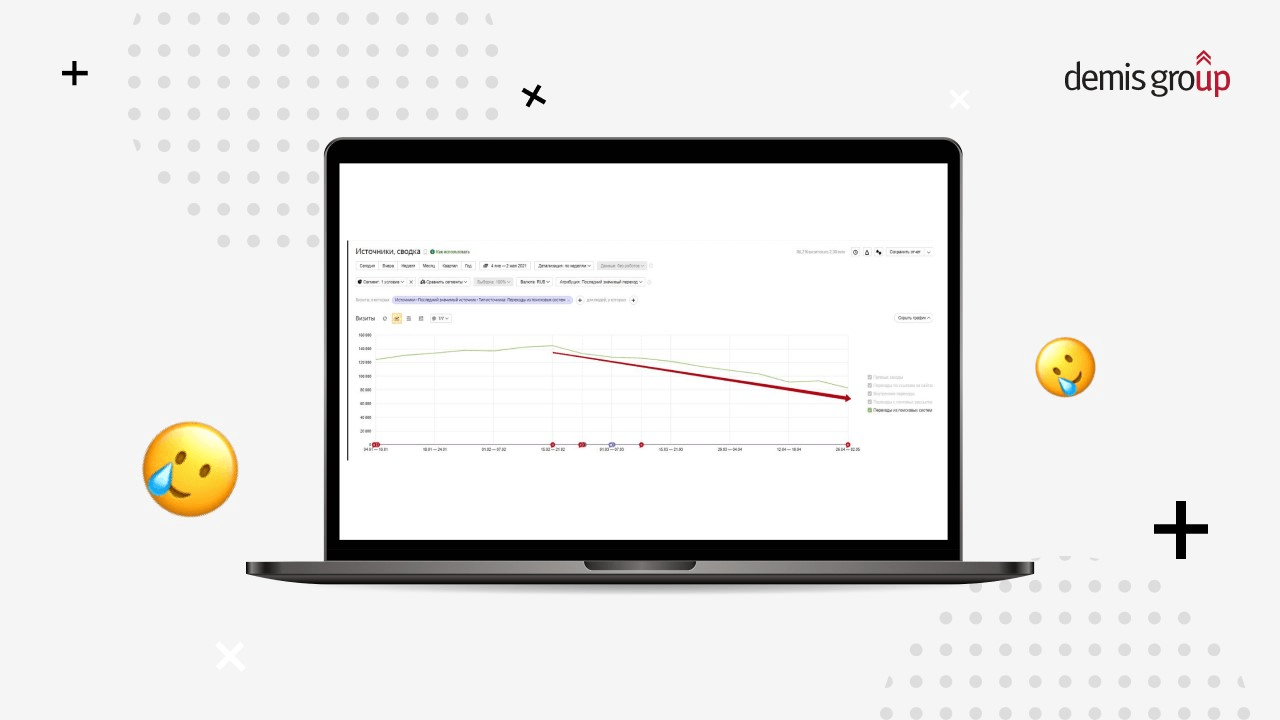 Как только стало ясно, что изменения являются структурными, команда Demis Group приступила к глубокому анализу ситуации. Важно отметить, что «ОхотАктив» не был единственным клиентом, столкнувшимся с падением трафика в тот период. У нас на абонентском обслуживании более 3000 проектов, поэтому данных для анализа было достаточно.