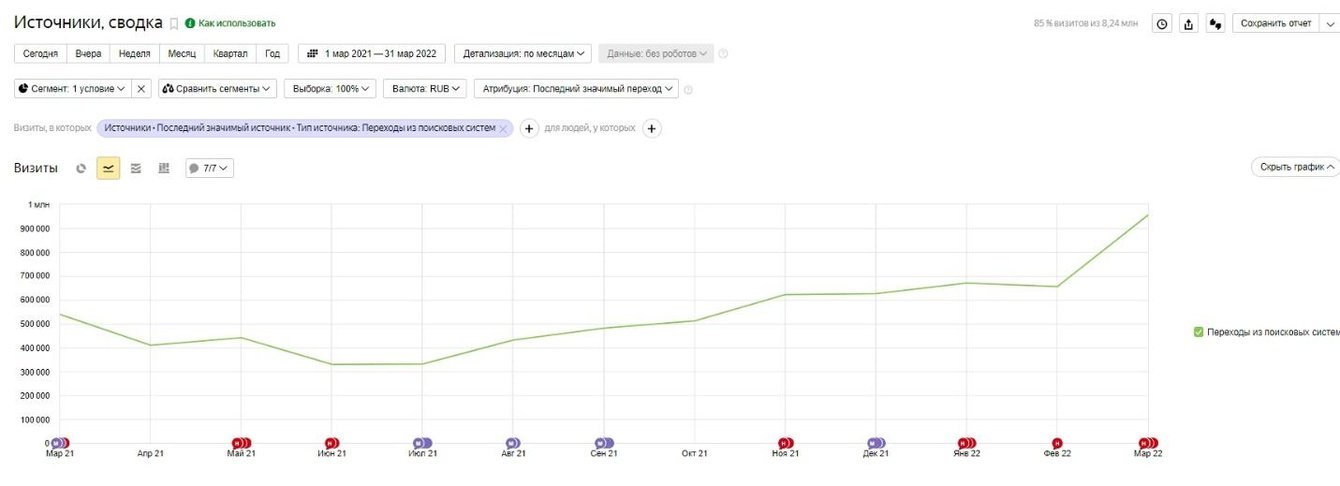 За год (03.2021–03.2022) трафик вырос почти в 2 раза — с 539 150 визитов до 955 064.