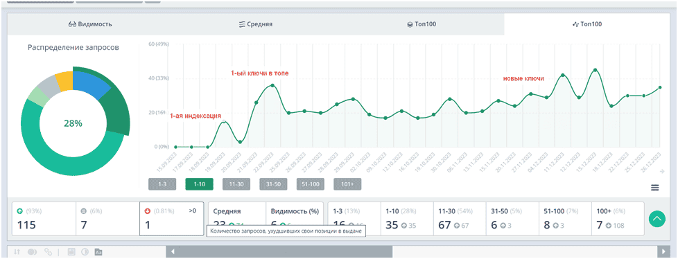 Спустя 2 месяца начали появляться в ТОП-10 новые ключевые слова. Только через 3 месяца после переезда отдельные запросы главной страницы стали появляться в топ-10. В конце февраля 2024 года главная страница сайта наконец закрепилась в ТОП-10 Яндекса.