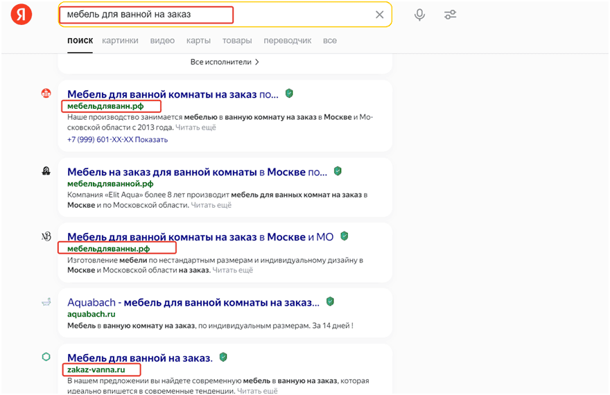 Проведя очередной комплексный анализ конкурентов, команда выдвинула интересную гипотезу. Оказалось, что в ТОП Яндекса по целевым запросам попадают либо крупные брендовые сайты с высоким ИКС (hoff.ru, leroymerlin.ru), либо ресурсы с прямым вхождением ключа «мебель для ванн» в доменном имени.