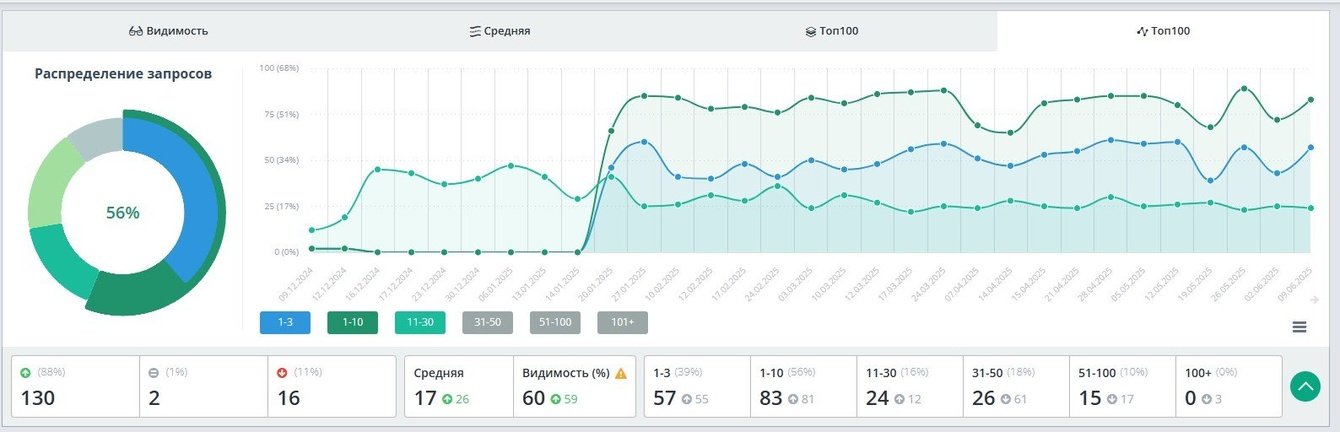 С этого момента показатели только улучшались. Сайт стал лидером ниши, заняв позиции в ТОП-5 по всем основным запросам. Заказчик начал получать действительно качественные лиды на комплексное оснащение ванных комнат. Почти 100% ключевых запросов вышли на первую страницу Яндекса, а 50% закрепились в топ-3. Команда смогла значительно превзойти первоначальный прогноз по количеству лидов и трафику.
