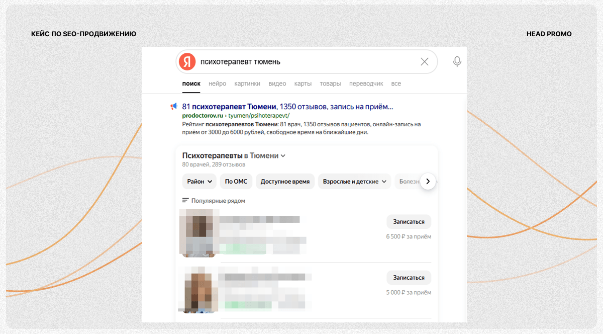 Одним из ключевых этапов стала оптимизация фида для Яндекса, благодаря которой врачи клиники стали отображаться в поисковой выдаче с подробной информацией: ФИО, специализация, рейтинг, отзывы и другие данные. Это повысило кликабельность сниппетов и улучшило видимость врачей в поиске.