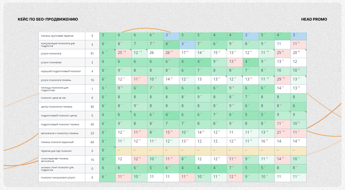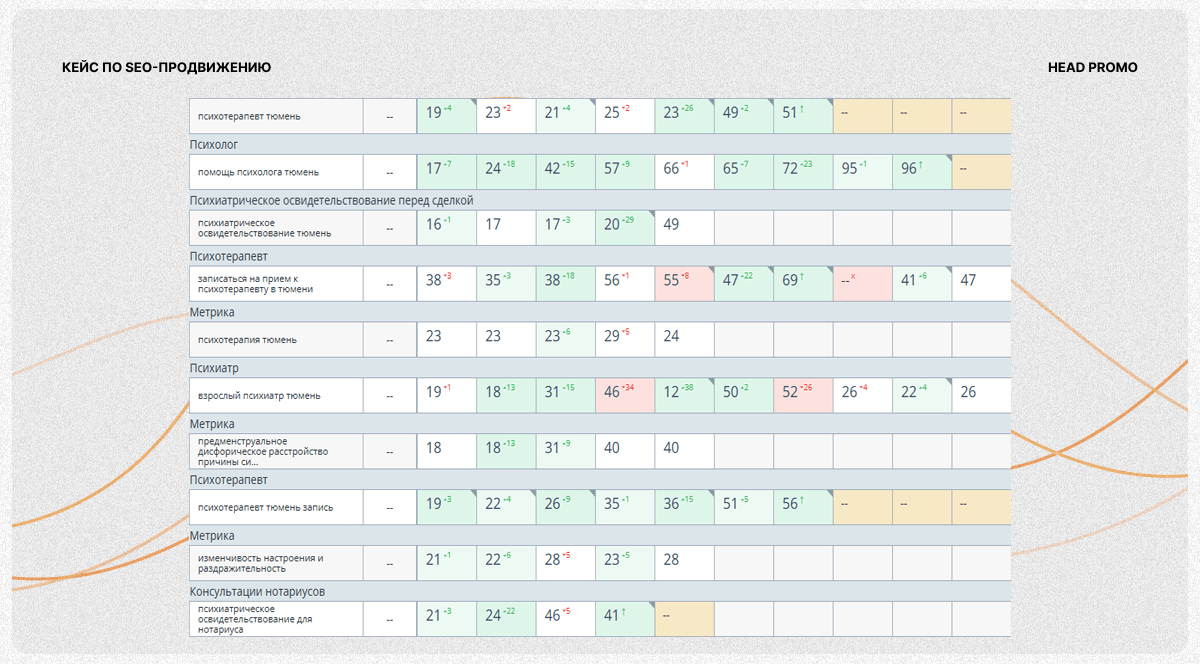– Занять ТОП-10 по основным запросам: “центр психотерапии”, “психотерапия тюмень”, “психотерапевт в тюмени”, “услуги психиатра”, “врач психиатр тюмень”, “услуги психотерапевта”