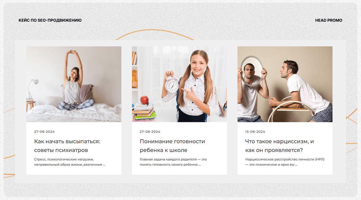 Дополнительно были созданы SEO-оптимизированные статьи на медицинскую тематику по консультациям психолога, которые решают вопросы пользователей и привлекают дополнительный трафик. Эти статьи помогли укрепить позиции сайта в Google и увеличить охват аудитории. Регулярное добавление контента, публикация информации также способствовали укреплению авторитета сайта в глазах поисковых систем. И как раз для статей очень важно придерживаться E-E-A-T факторов.