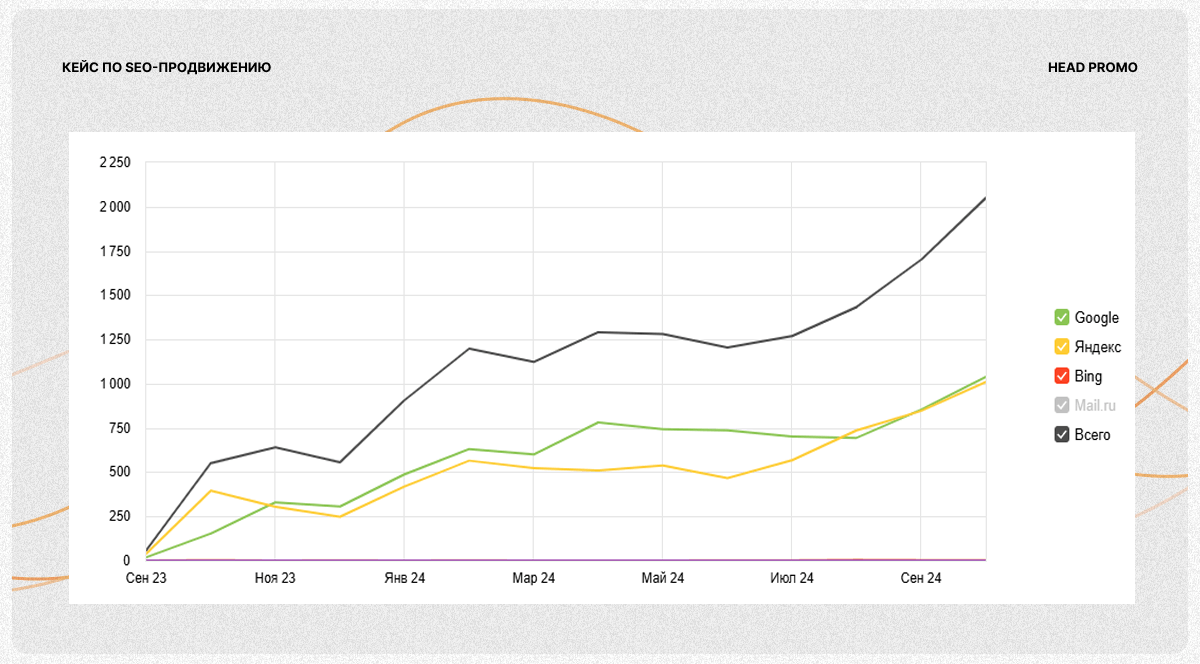 По большинству целевых запросов мы достигли первой страницы выдачи, уверенно встали в ТОП-10, а по многим категориям запросов и в ТОП-5
