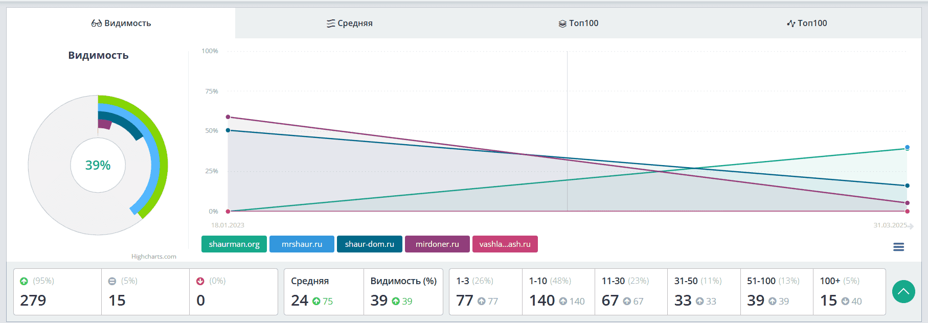 Четверть запросов находится в топ-3, причем среди них именно те, которые приоритетны для заказчика. По видимости обошли всех прямых конкурентов — в топ попали трафиковые запросы, а не пустышки с нулевой частотностью.