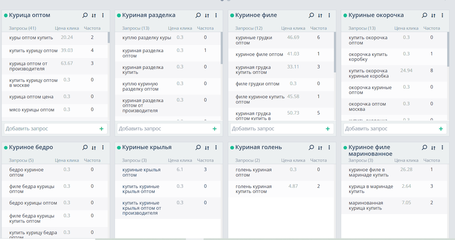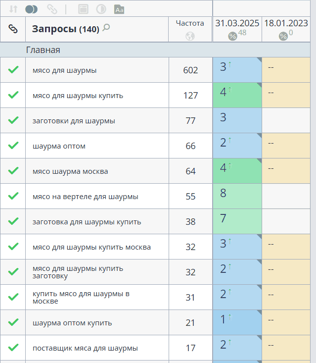 Структура каталога получилась интуитивно понятной: «Мясо для шаурмы», «Куриная разделка», «Фарш и сосиски». Каждый раздел закрывал определенный кластер запросов. Последующие результаты подтвердили правильность кластеризации — большинство приоритетных фраз вышли в топ.