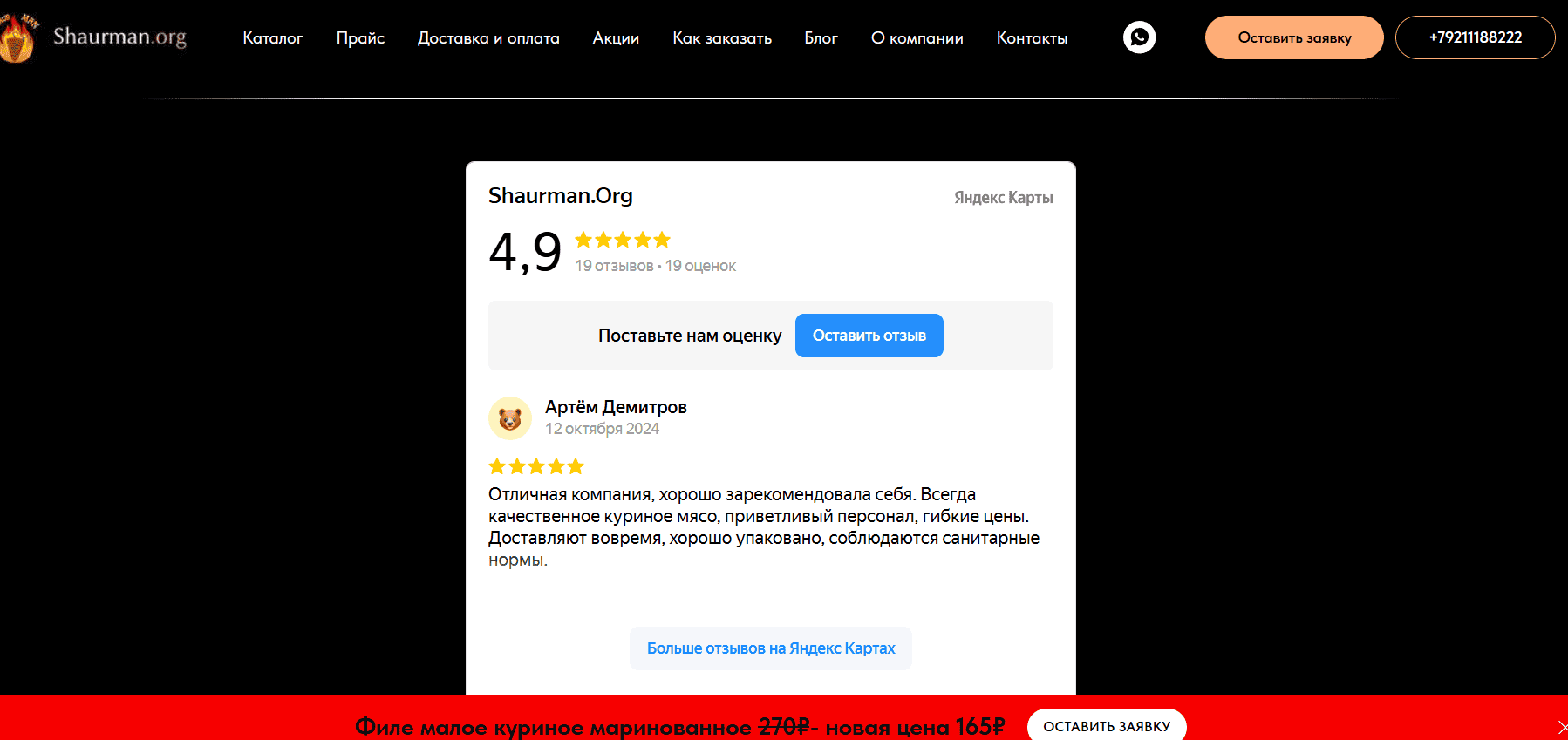 Карточка в Яндекс.Бизнес стала дополнительным каналом доверия. После модерации через видео её максимально наполнили товарами, фотографиями продукции, контентом во всех доступных разделах. К сентябрю 2025 года рейтинг достиг 4.9 при 19 оценках. Виджет от Яндекс.Карт интегрировали на сайт для подтверждения реальности бизнеса.