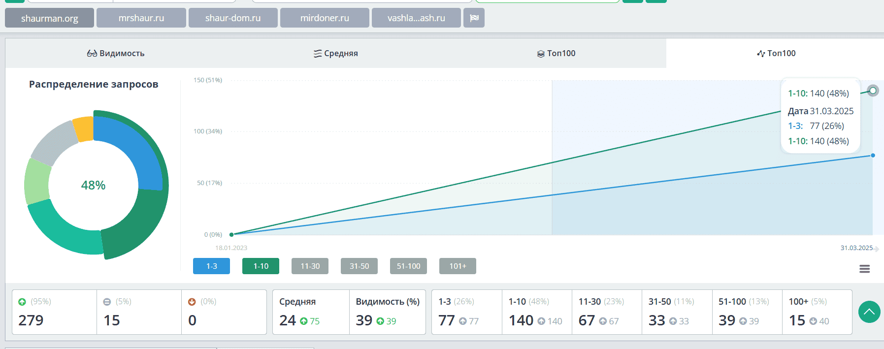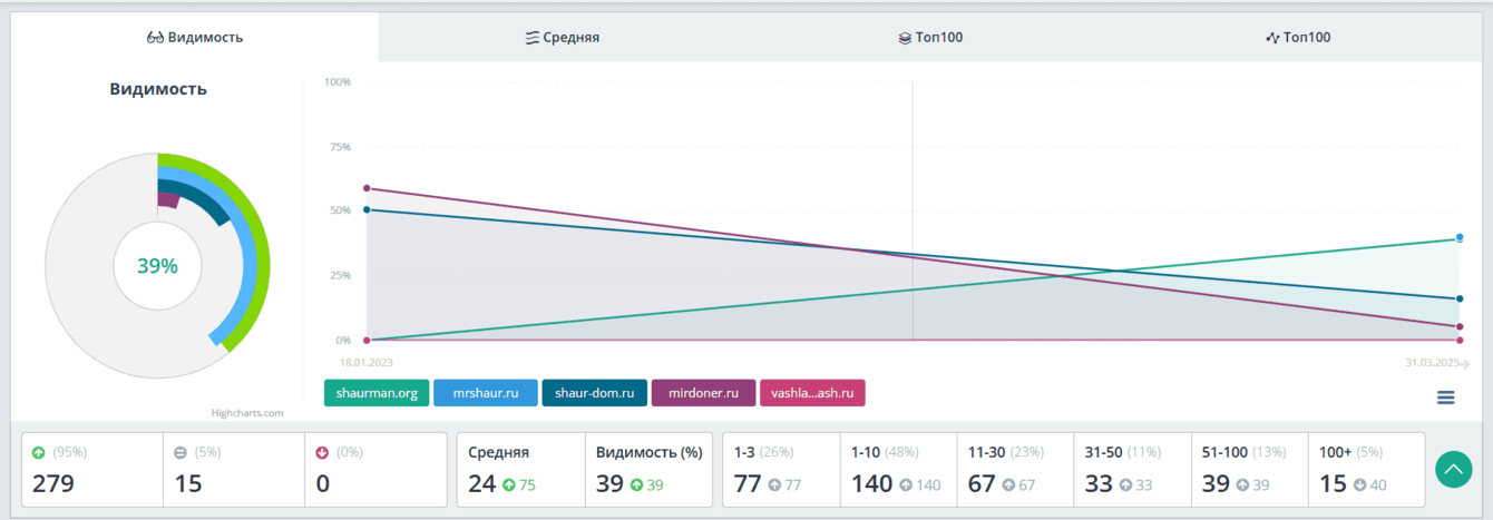 В Яндекс за два года (2023-2024) половина коммерческих ключей стабильно удерживается в топ-10. Общее количество продвигаемых фраз — около 300.