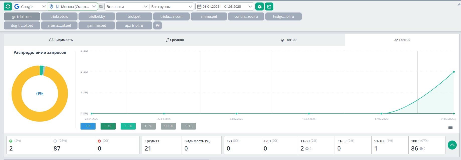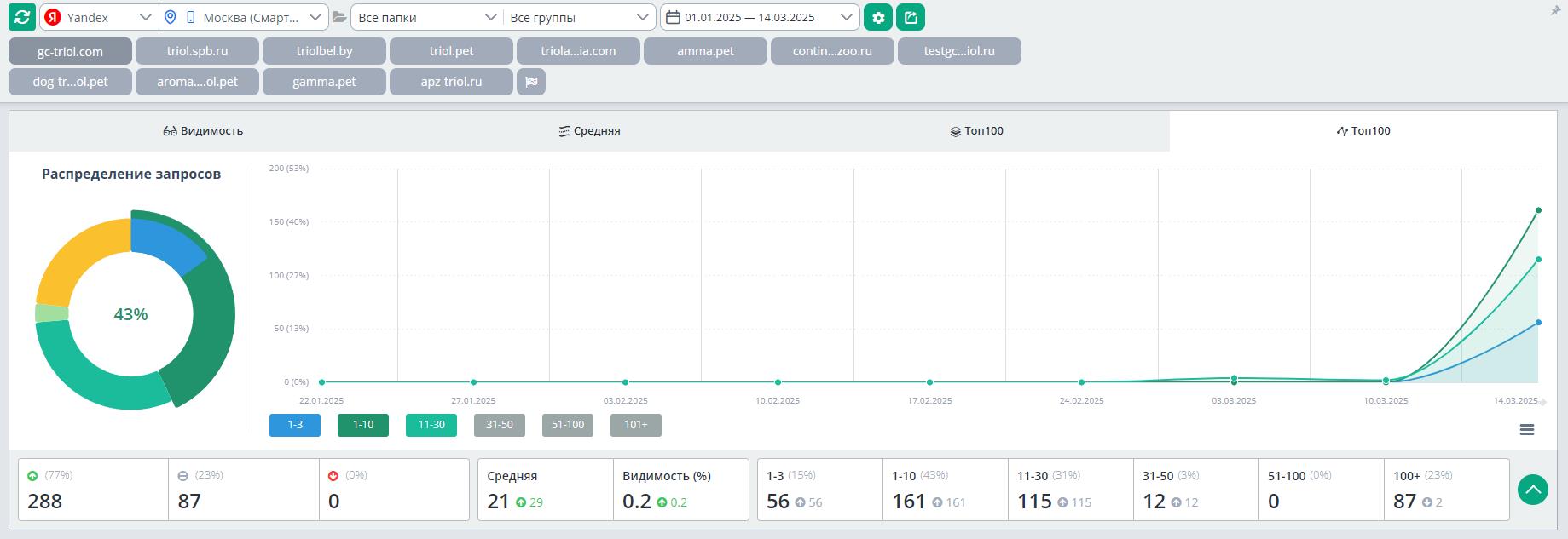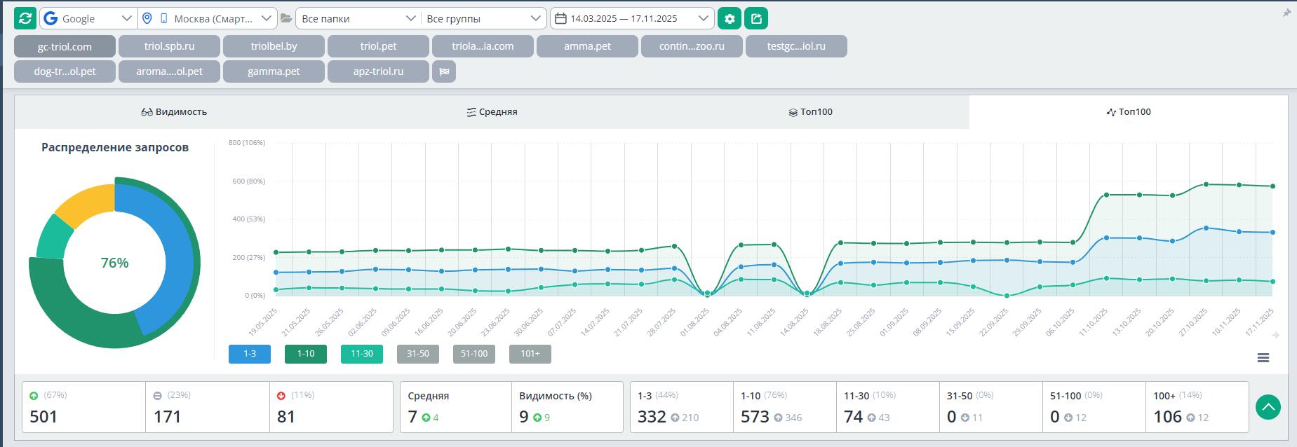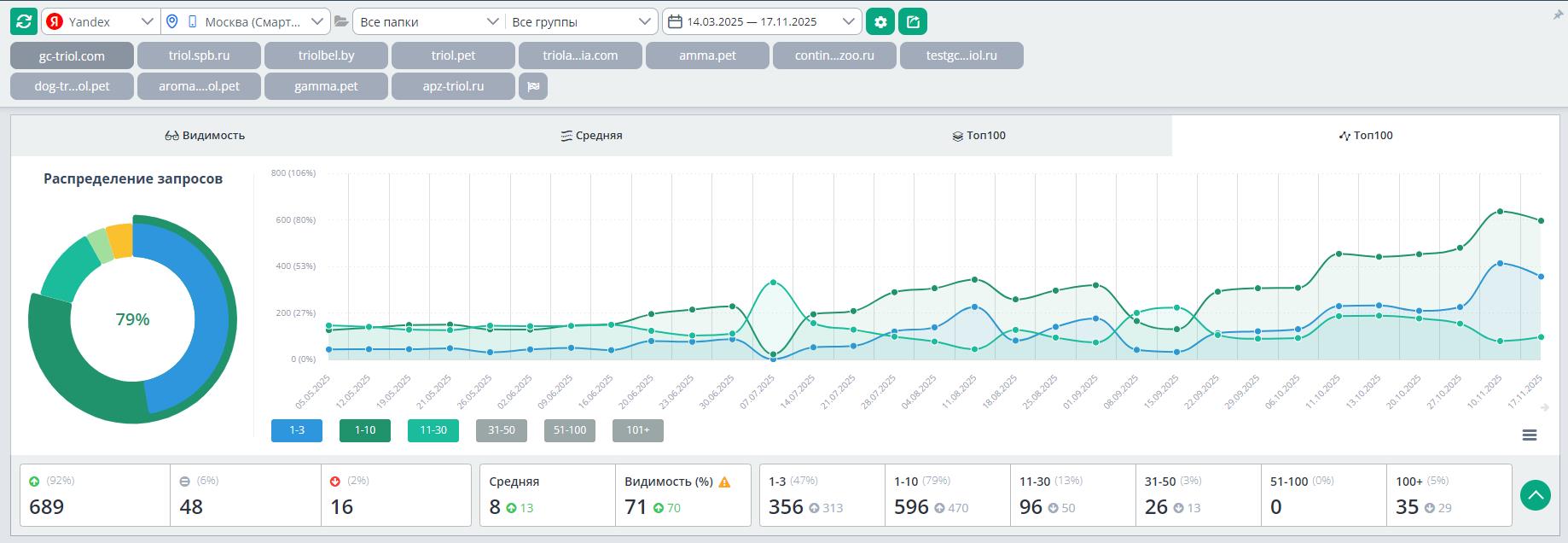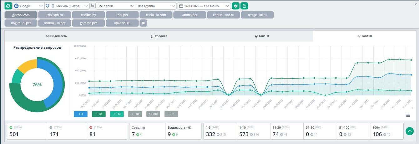 К ноябрю 2025 года сайт прочно закрепился в лидерах ниши. Анализ видимости показывает доминирование по большинству целевых кластеров.