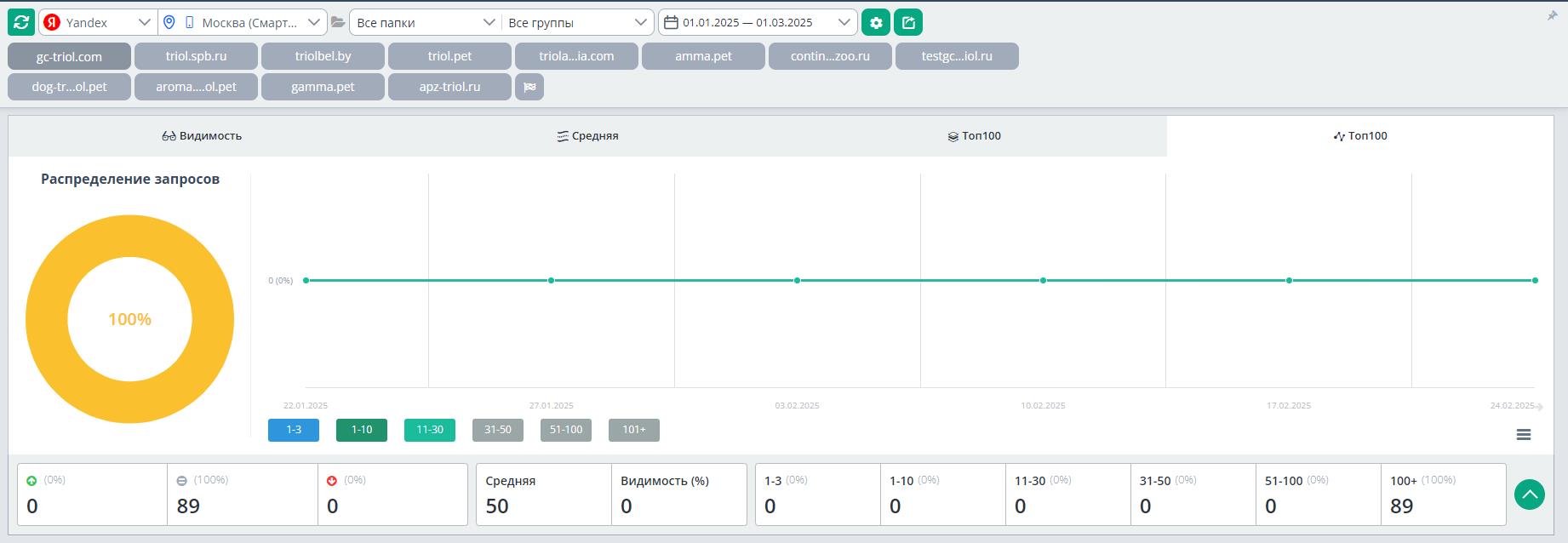 ● Нулевая видимость. Несмотря на наличие трафика, анализ в TopVisor показал отсутствие сайта в выдаче по коммерческим запросам.