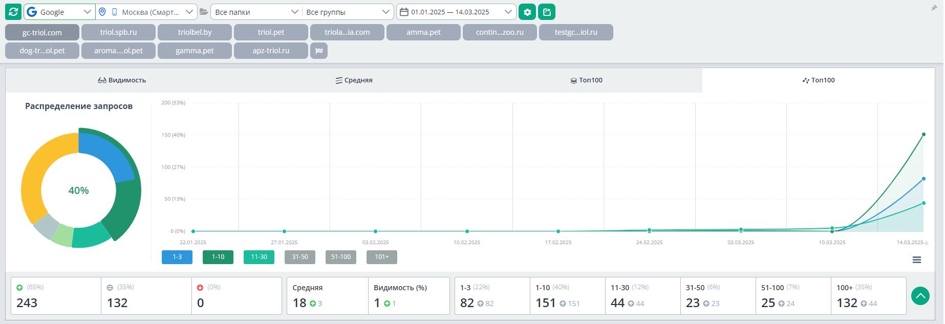 Перелом наступил в марте 2025 года. Поисковые системы "переварили" оптимизацию. Начался плавный рост позиций. Основной упор делался на региональную выдачу, так как клиент заинтересован в покупателях на местах.