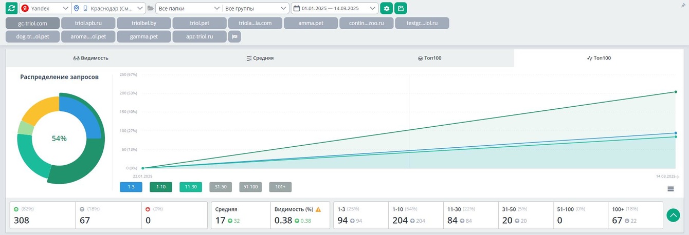 Краснодар (Яндекс): 54% видимости в первой десятке.