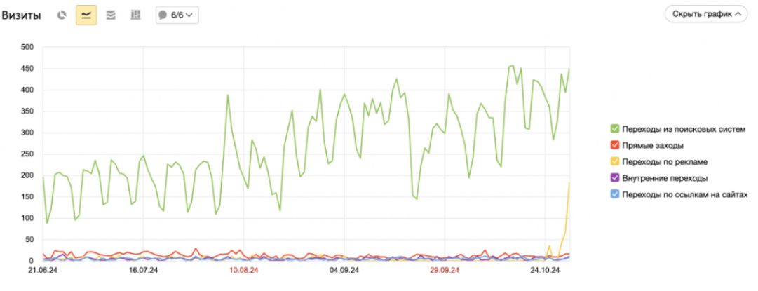 В результате переработки структуры сайта, работы с интентом и внедрения SEO как инструмента продаж, а не просто источника трафика, проект показал измеримый и устойчивый рост главных показателей: