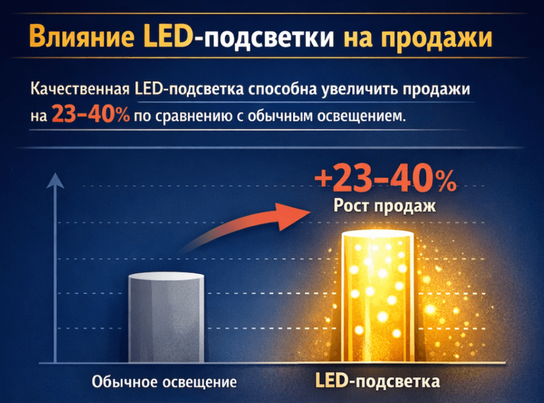 По данным Международной ассоциации освещения, качественная LED-подсветка товаров способна увеличивать продажи на 23–40% по сравнению с обычным освещением. При этом около 67% владельцев магазинов не уделяют освещению должного внимания, фактически теряя часть потенциальной выручки уже на этапе восприятия товара.