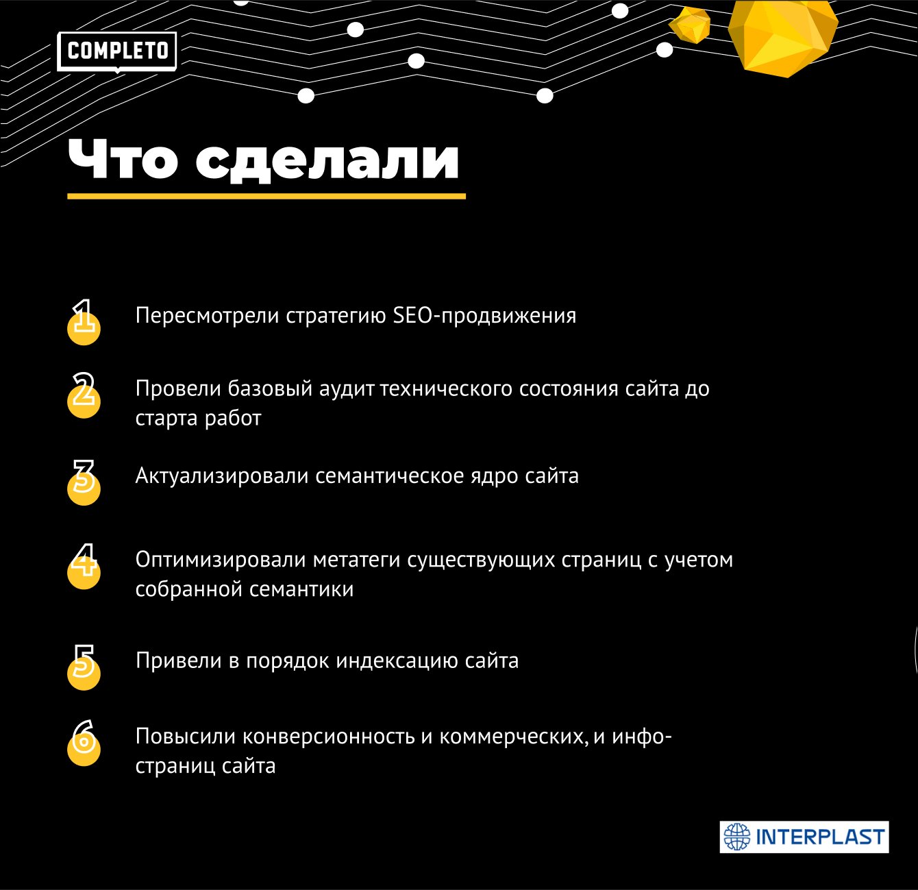 Более того, чтобы сайт Интерпласт оставался привлекательным для поисковых систем, специалисты Комплето ежемесячно анализируют состояние ресурса и оперативно исправляют возникающие ошибки.