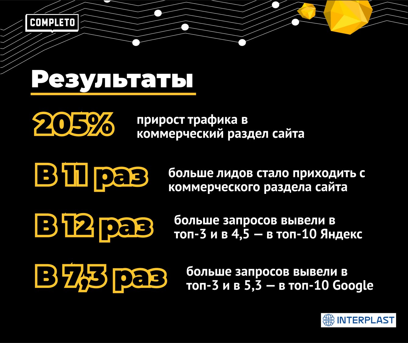 Благодаря этим изменениям сайт Интерпласт не только стал получать больше целевого трафика, но и значительно повысил его конвертацию в лиды — что и являлось основной целью клиента