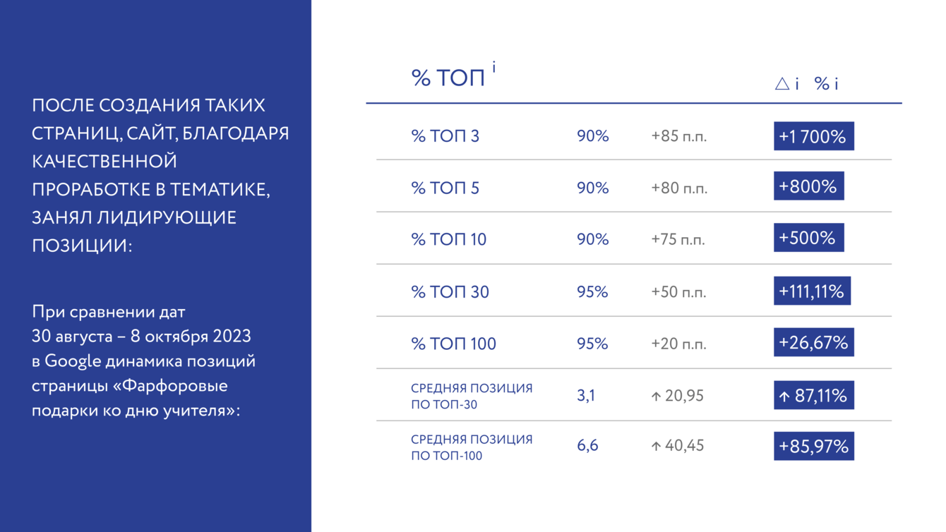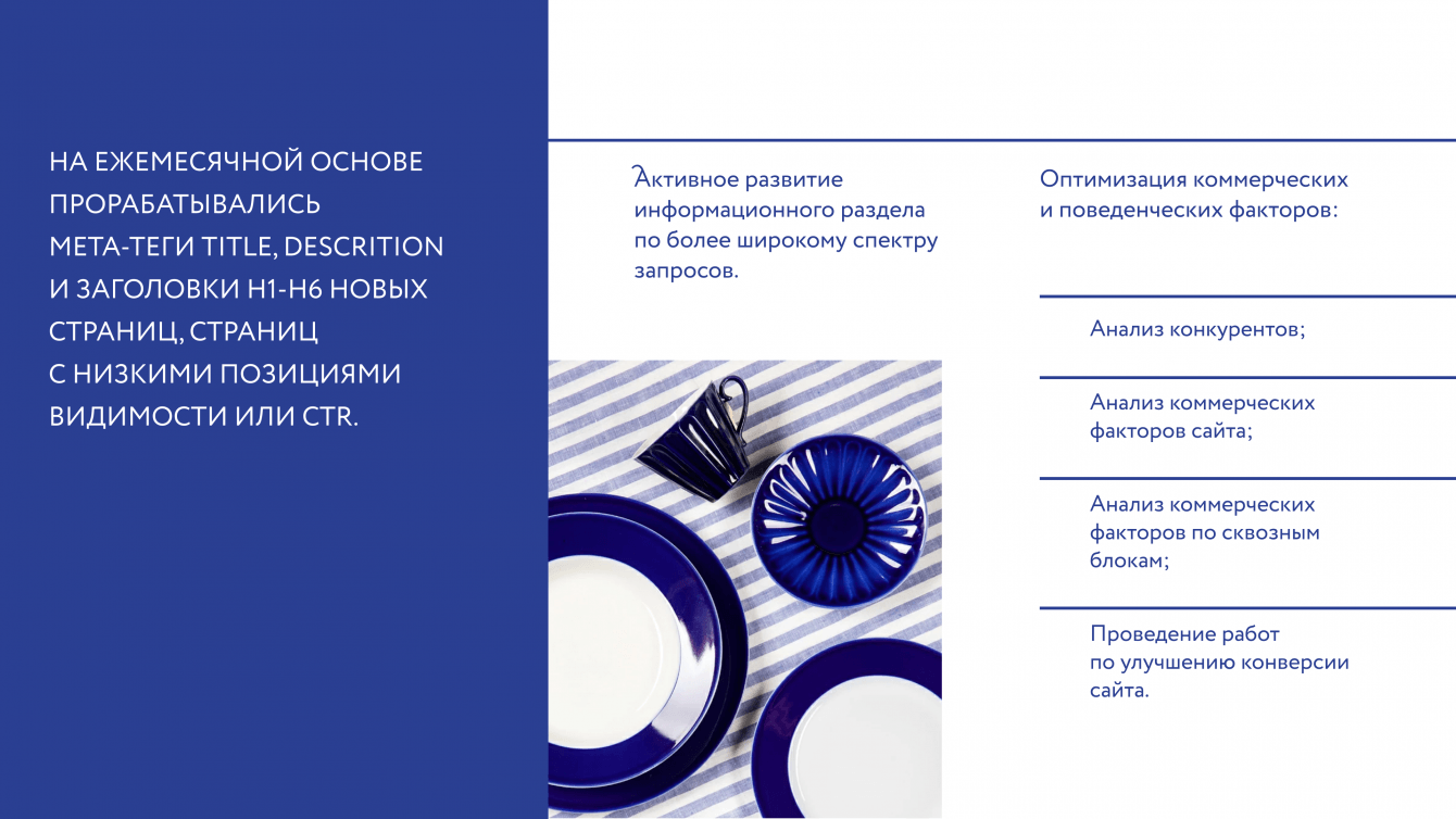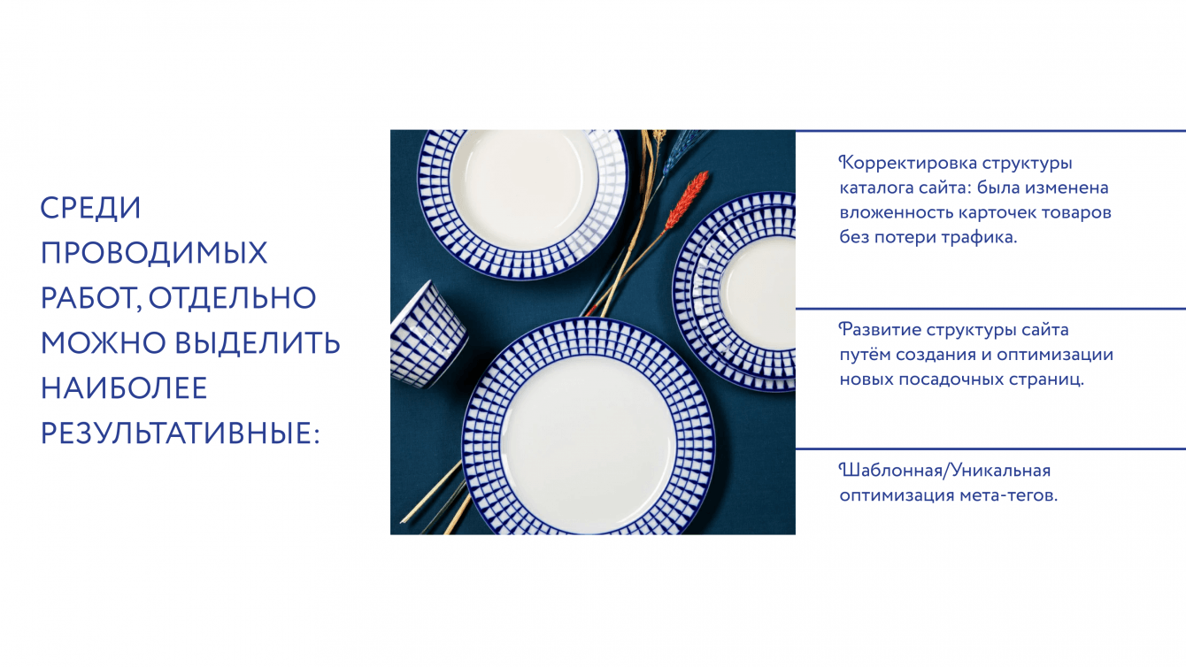 Было собрано большое семантическое ядро, в котором также были выделены лексические группы под которые можно было создать посадочные страницы, например по направлению "Фарфоровые чашки".