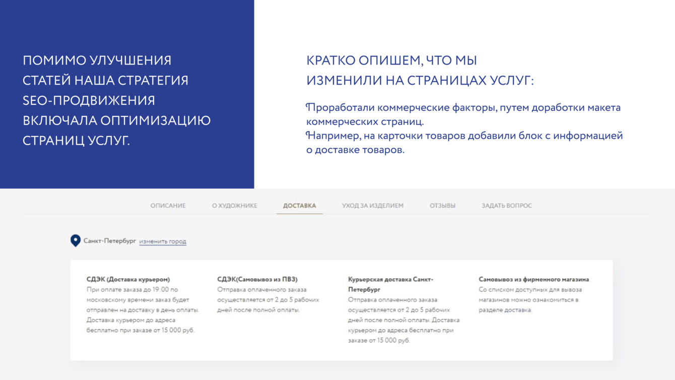 Мы проработали коммерческие факторы, путем доработки макета коммерческих страниц. Например, на карточки товаров добавили блок с информацией о доставке товаров.