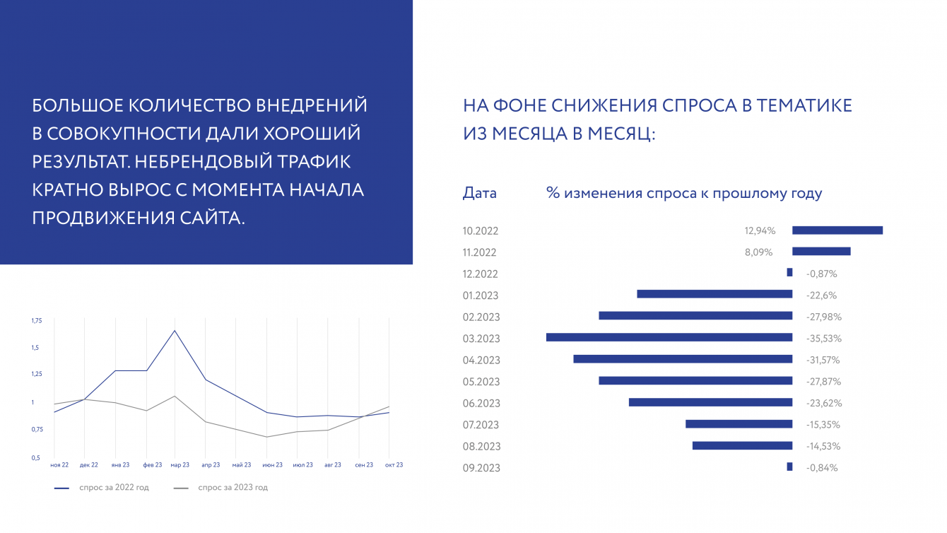 Большое количество внедрений в совокупности дали хороший результат. Небрендовый трафик кратно вырос с момента начала продвижения сайта.