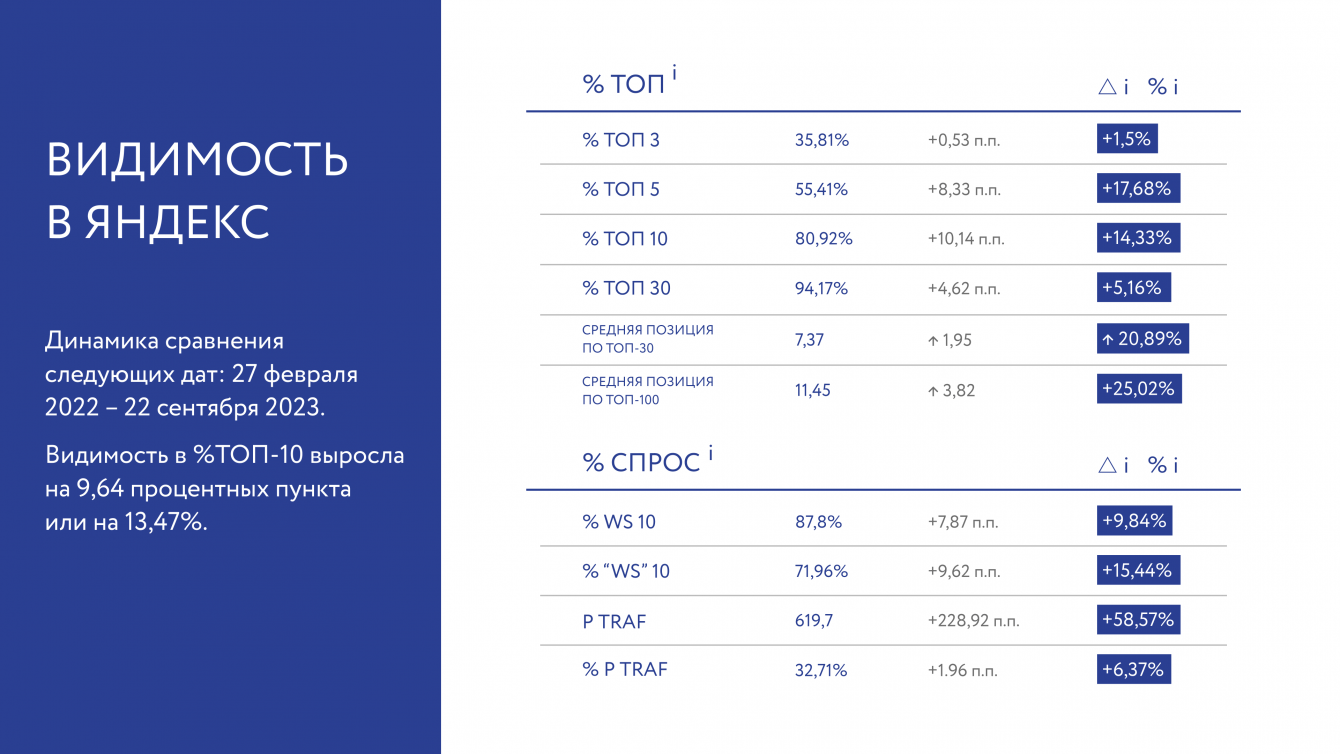 Благодаря проведенным работам, мы увеличили видимость в %ТОП-10 Яндекс на 13,47%