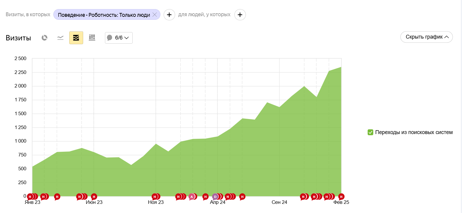 Большинство запросов были низкочастотными, то ресурс с первых месяцев получал именно высокоцелевой трафик и несмотря на узкую нишу, число посетителей из поисковых систем за первые полгода выросло в 4,5 раз (старт в марте), а к концу 2023 года прирост составил 577,6%. Также по итогу работы удалось закрепить позиции сайта в ТОП 10 по 81 ключевому запросу, и в 6 раз возросло количество посетителей сайта.