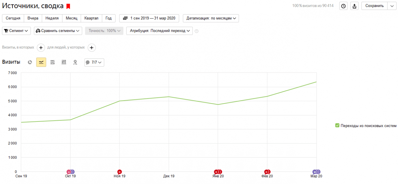 За полгода продвижения сайта визиты из поисковых систем выросли в 2 раза (с 3200 визитов в месяц до 6500 визитов в месяц). Показаны данные из сервиса статистики Яндекс.Метрика с 1 сентября 2019 года по 31 марта 2020 года в раскладке по месяцам: