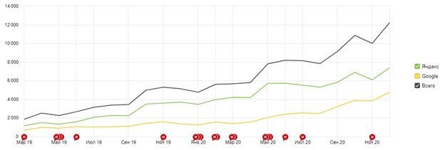 Чем выше посещаемость, уровень поведенческих факторов и количество постоянных пользователей у сайта — тем выше ИКС (индекса цитируемости) сайта. Рост ИКС сайта клиента с марта 2019 года: